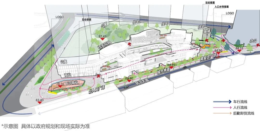 尊贵落客,采用全地库停车方式,于梅观高速一侧设置多处车行、公交站出入口,规划人车动线,减少车流对景观、行走流线对商业界面的干扰。