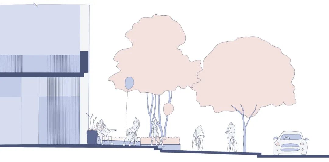 景观设计打造尺度宜人的林荫大道,能够满足步行和骑行,增设可供休憩的台阶、桌椅,人们能够无所顾忌地购物、散步、让孩子在环境中自由活动,没有噪音、废气和持续的风险。考虑到当地的天气,我们对园路两边植物的种植密度、树种选择及配置方式进行重点研究,为居者营造夏季绿荫、冬日暧阳的体验感。