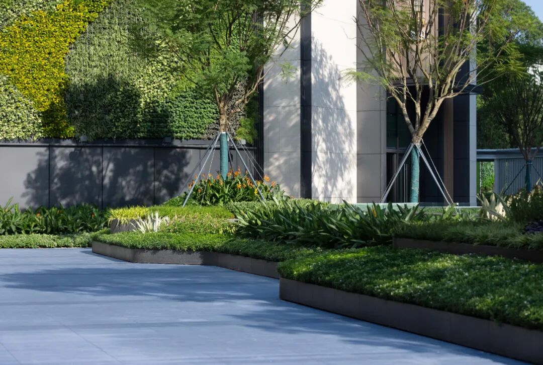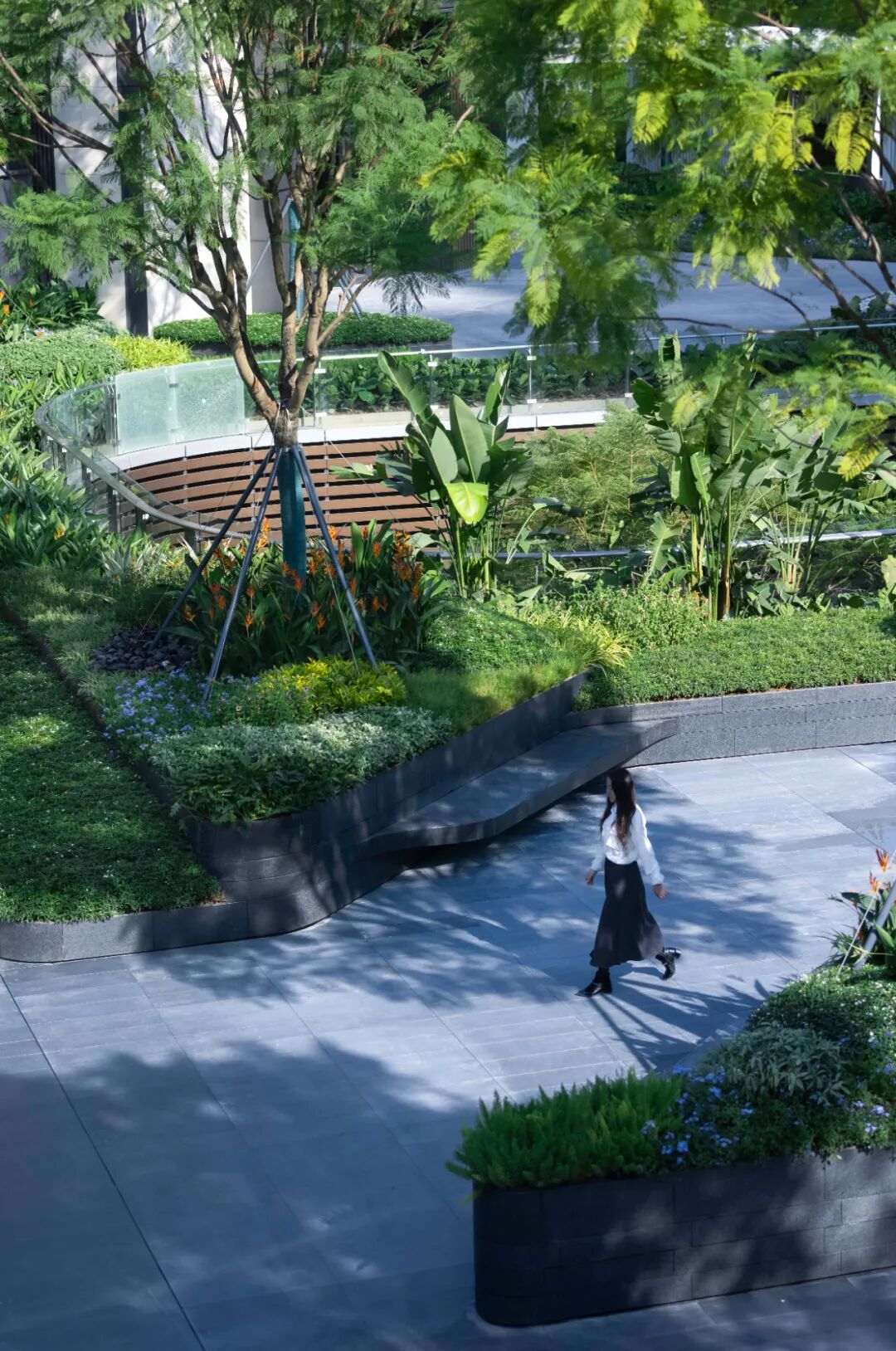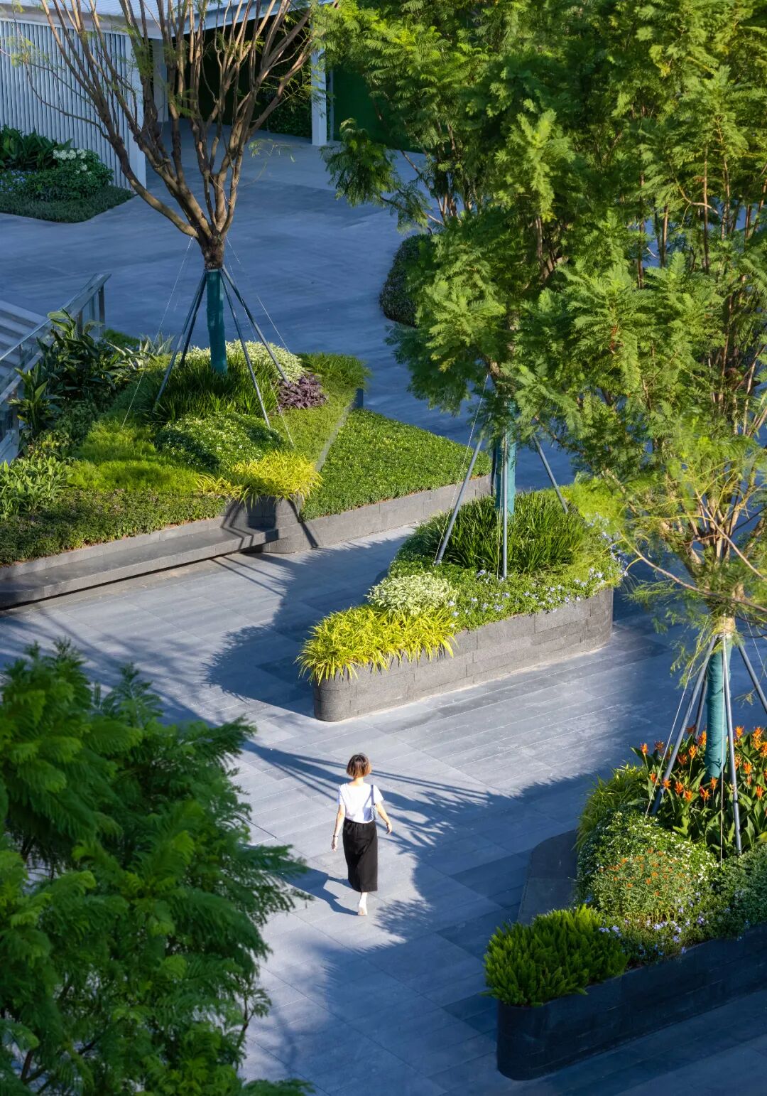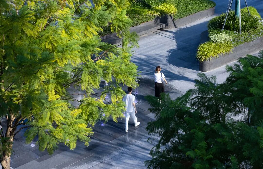 通过植物营造生态绿意、漫步林荫的街区氛围,依据本土气候条件,结合场地尺度与特征,打造当代人向往的理想生活圈。广场植物以树形开展、花开繁盛的乔木打开视野,借由宁静沉稳的蓝花楹、奠定空间清新基调,局部使用垂吊植物结合建筑立面形成热带丛林氛围。身处于此,感受植物的四季魅力,缓解城市生活压力。