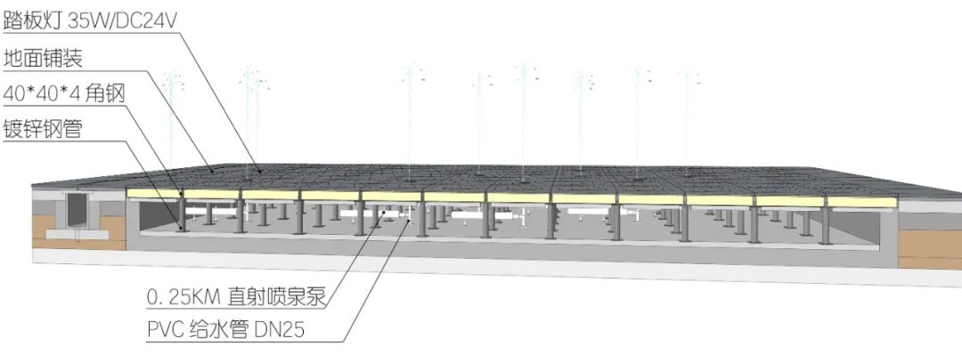 项目旱喷水景采用钢管加通长角钢固定,其主要特性:维护方便、承压能力强、使用寿命长、稳定性高,搭配透水砖,达到地面快干效果,打造一个更安全有趣的游戏空间。
