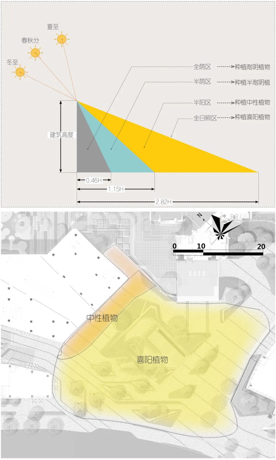 结合地面所接受的能量的多少, 通过对冬至日、春秋分及夏至日的光照分析叠加得出,则建筑的阴影面可以划分为全荫区、半荫区、半阳区、全日照区。