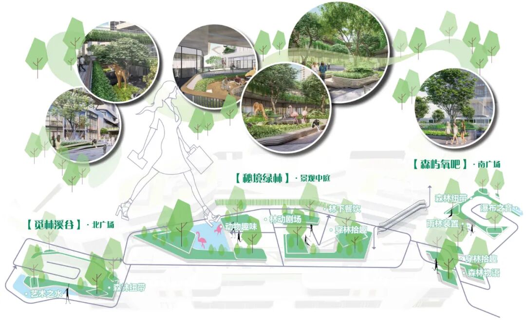 融入绿藤、密林、水等自然元素,构造觅林溪谷、秘境绿林、森屿氧吧三大沉浸式森林公园场景,并结合丛林动物趣味形象,设置IP 打卡,强化场地记忆,形成公园式街区商业整体空间, 获取艺术之水、瀑布之音、森林纽带、林动剧场、穿林拾趣、森林物语等多重购物体验。