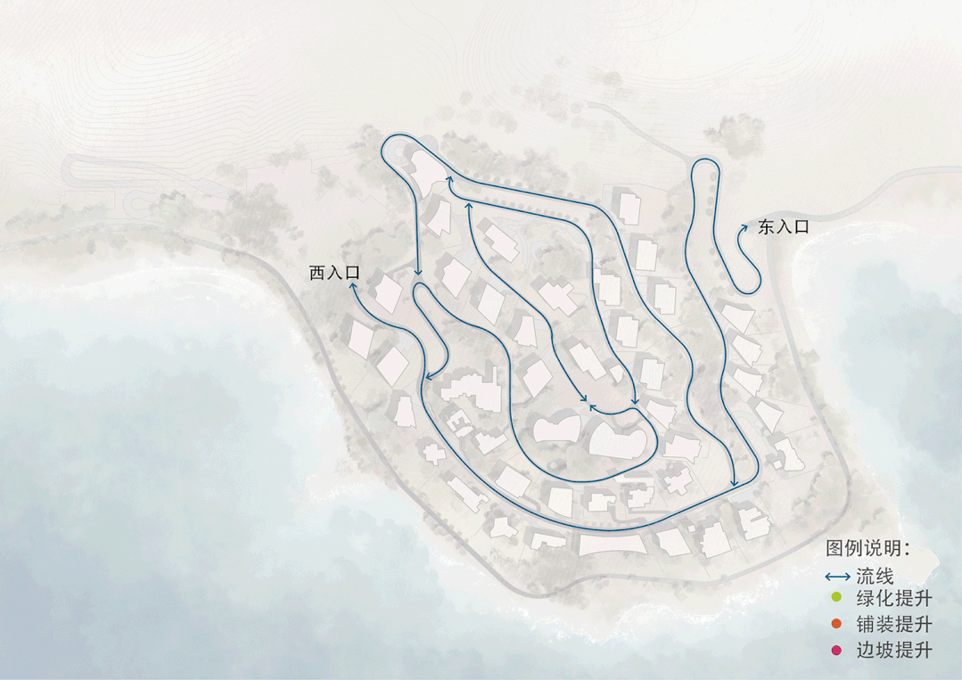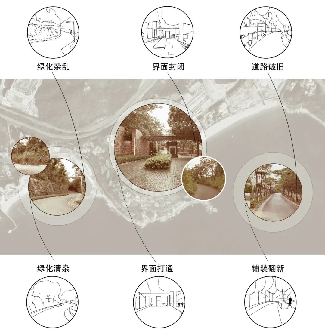 为保护并突出周边的自然绿色景观,设计旨在避免大规模的建设与开发,通过前期调研梳理出了场地的特征、区域环境提升点。道路部分从场景再造、功能补入、景观延伸入手,使建筑与道路以及场地环境融为一体。