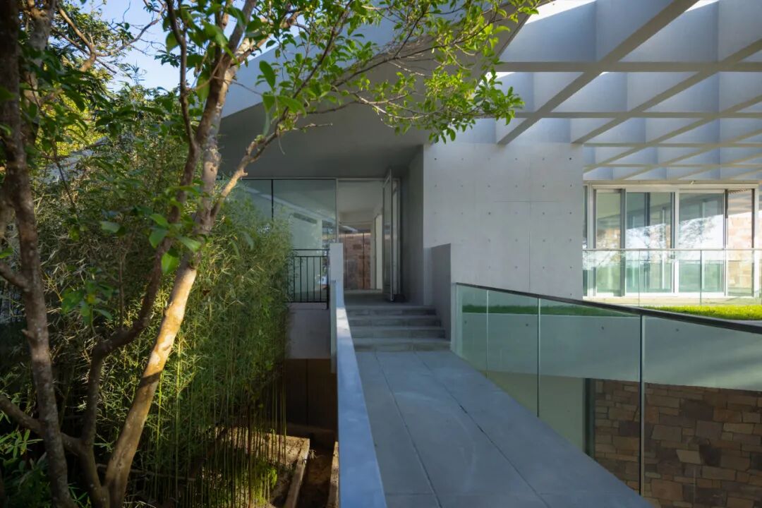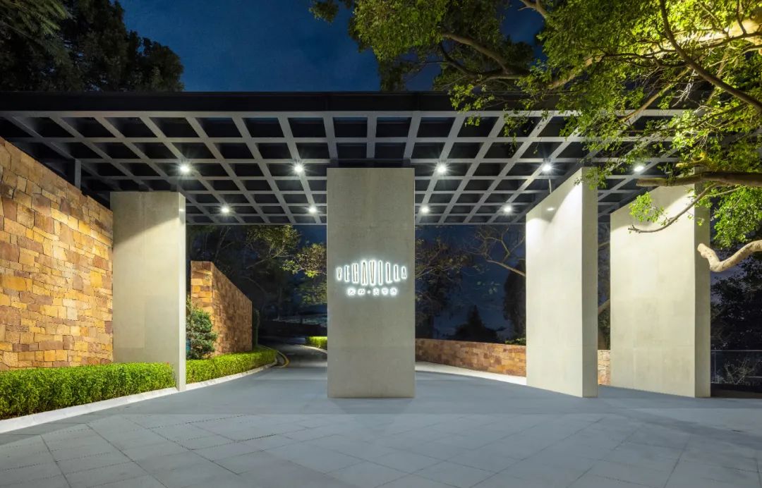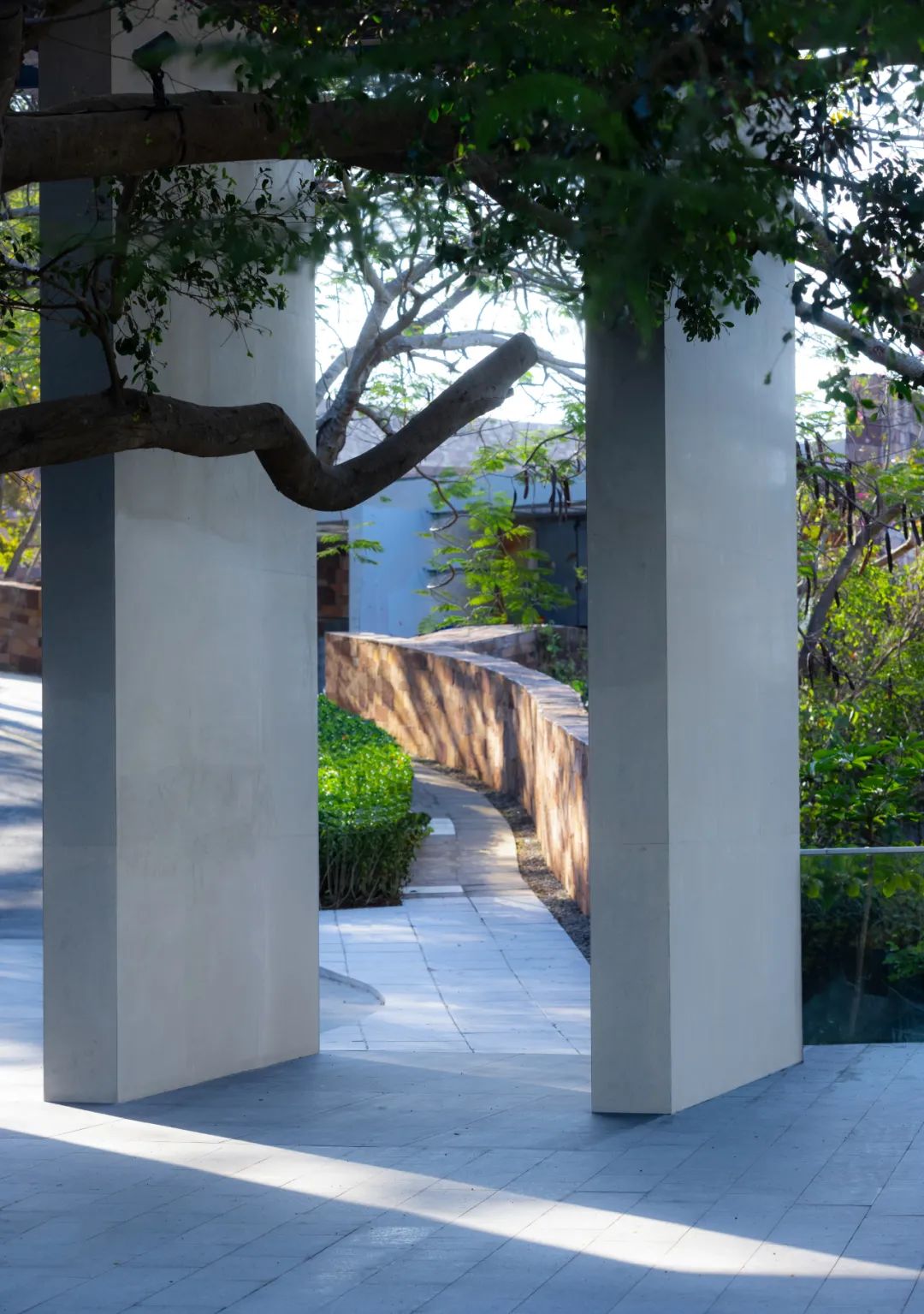 设计将门廊隐于树后,门廊与原生大树之间形成框景之势,如同一幅画卷,延续了空间的原始之美。纯粹却极富表现力的原始材料,构成了一种艺术张力,呈现出极致工艺与原生质感的完美融合,藉此进一步回应了设计的最初理念。