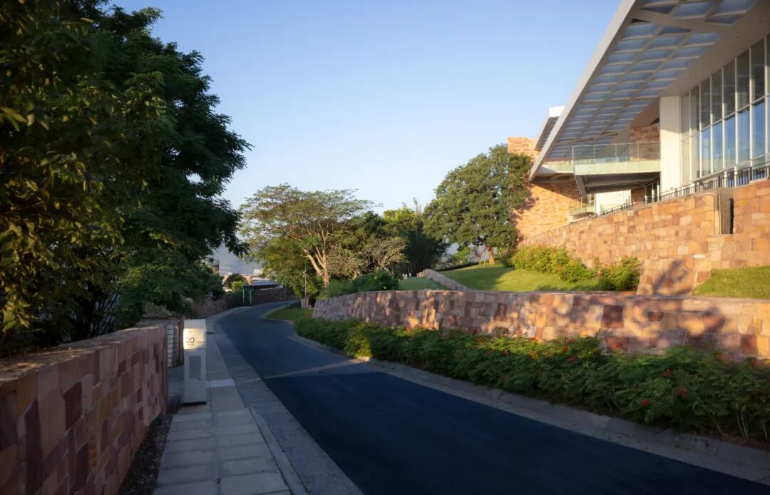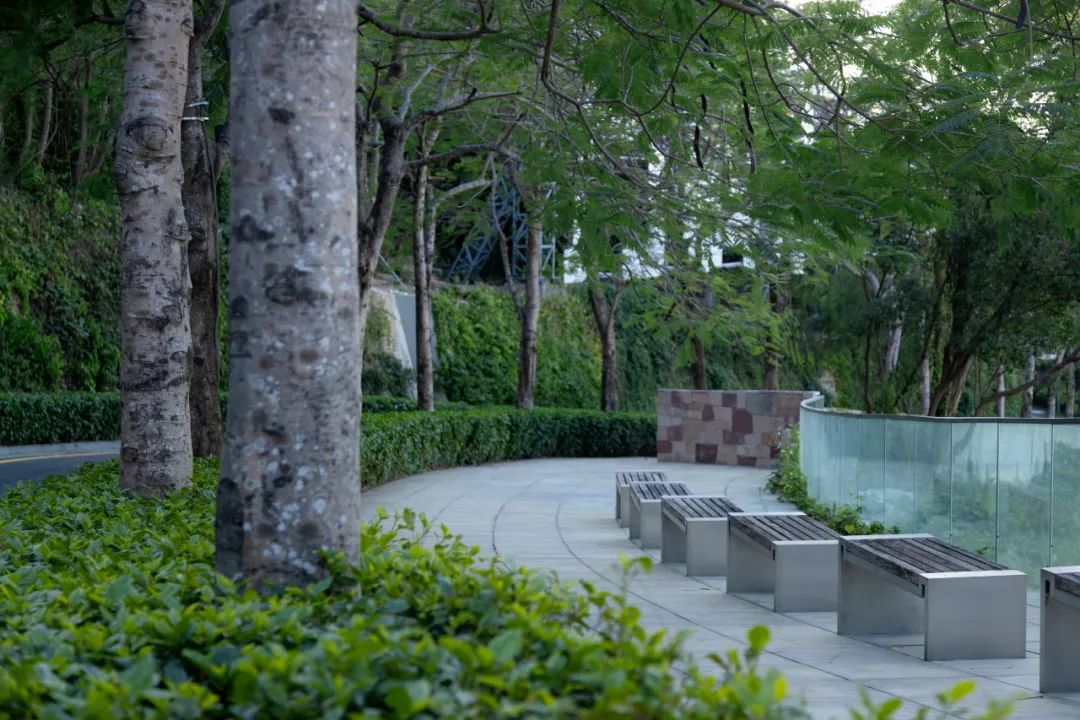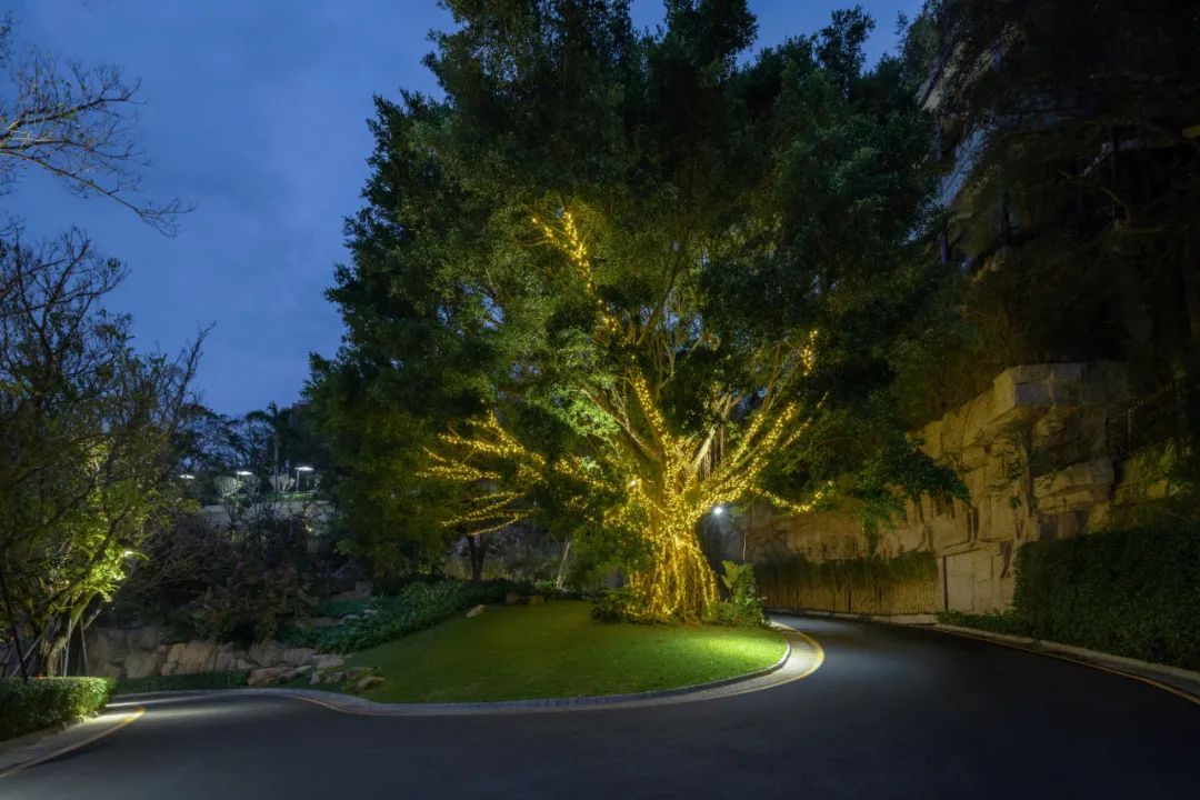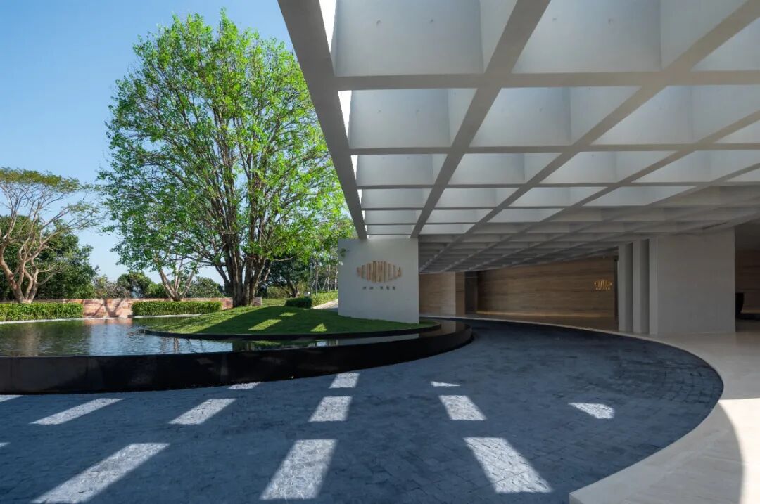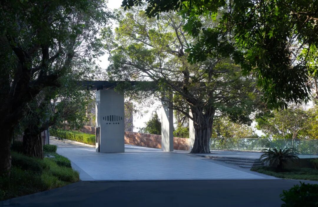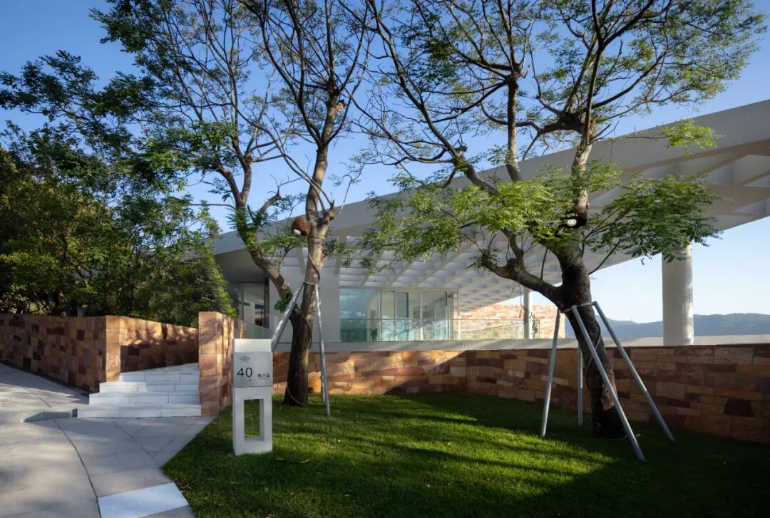 主景节点结合建筑的色彩、形式以及特色,将景观、建筑及自然串联,孤植点景大树创造出一个环绕式空间,呈现出自然律动之美。