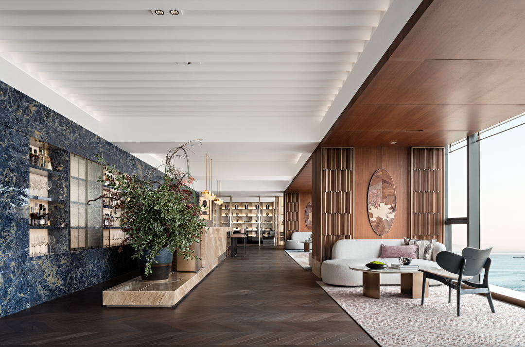 设计以一整面的通透,将最极限的海开放给予了观海酒廊。海以具象的奔腾而来,天光一线助燃了空间氛围。