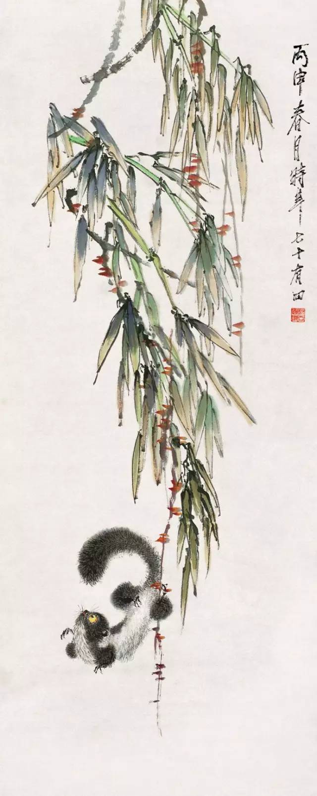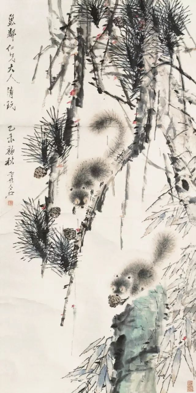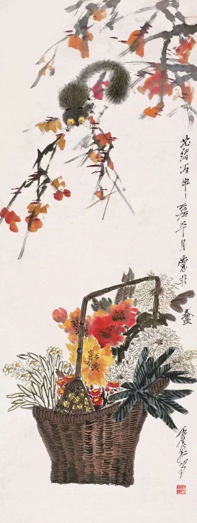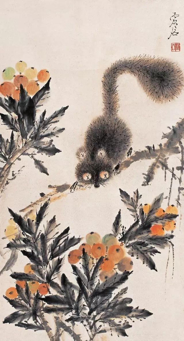 虚谷早年学界画,工人物写照。擅花果、禽鱼、山水,尤长于金鱼、松鼠,他继承新安派渐江、程邃画风并上溯宋元,又受华新罗等扬州画家影响,作品中对象的造型奇特,章法与众不同。作品有苍秀之趣,敷色清新,造型生动,落笔冷隽,别具风格。