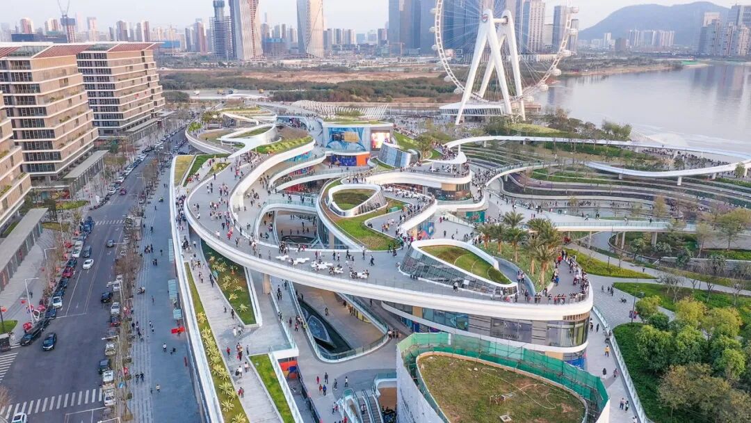 从东岸商业街区绿化屋顶远眺湾区之光摩天轮及海滨文化公园步道© OCT华侨城