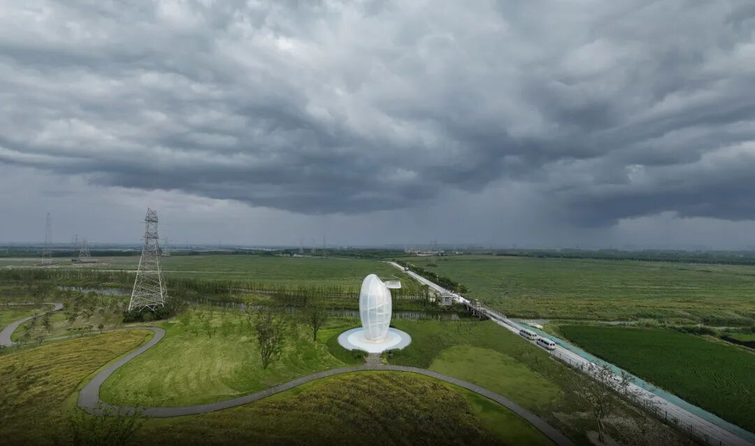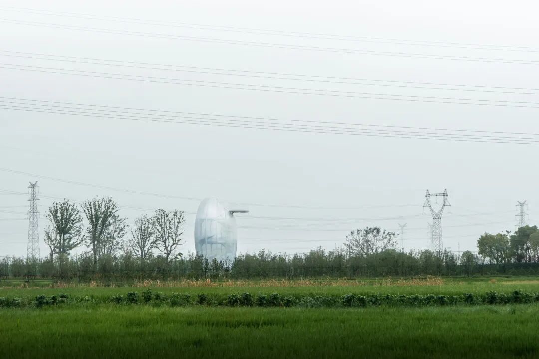 这个半透明的蛋状结构独立地矗立在田野中央,看起来不只是特别,而且像是外星人的产物,造型几乎完全是电影《降临》中的建筑翻版。更奇怪的是,楼梯包裹在ETFE膜气枕系统中,材料在一侧没有尺寸限制,让塔身外观兼具有机性和人造性。隐藏在楼梯下的充气机将空气注入整个系统,使结构呈现出圆润的外观。