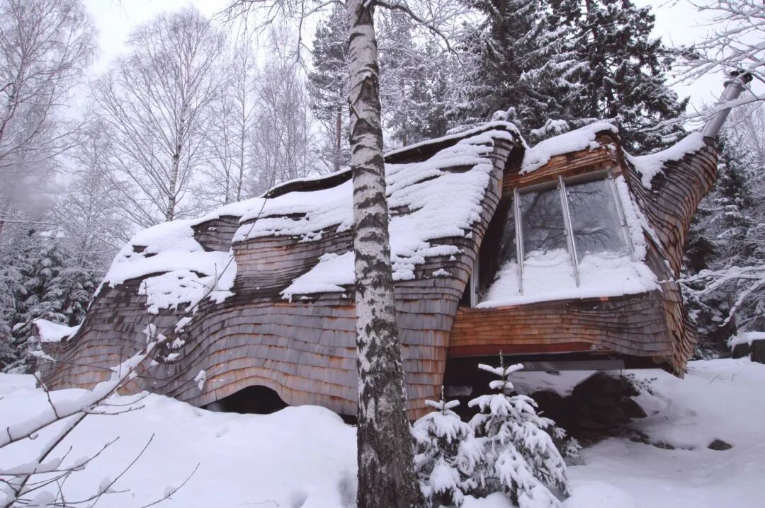小屋凭借其红色雪松木瓦壳,自然地隐藏在粗糙的森林环境中,整个冬季都被白雪覆盖,几乎看不见建筑的轮廓。如果邪恶的女巫住在Dragspelhuset的小屋里,也许会有很多路人掉到女巫的汤锅里。