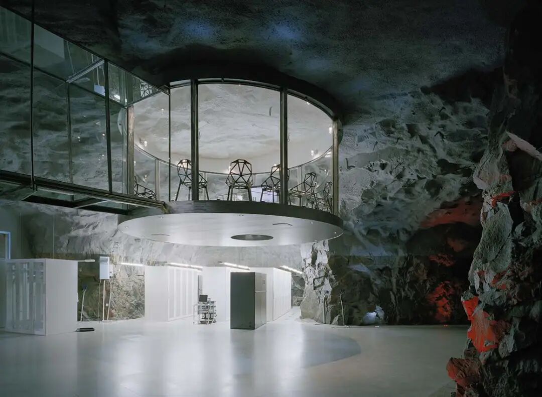 有人看到这个空间会说很酷,也有人觉得毛骨悚然,毕竟我们都知道,在任何电影中,隐藏在地下洞穴中的实验室通常意味着反派正在策划一些坏事。项目坐落在一个以前的反原子庇护所,也就是斯德哥尔摩Vita Berg公园的花岗岩岩石下方30米处,雕刻的石墙包裹着悬挂的玻璃胶囊,这些胶囊具有绝密实验的所有特征,项目实际的用途是为互联网提供商提供服务器和办公室。
