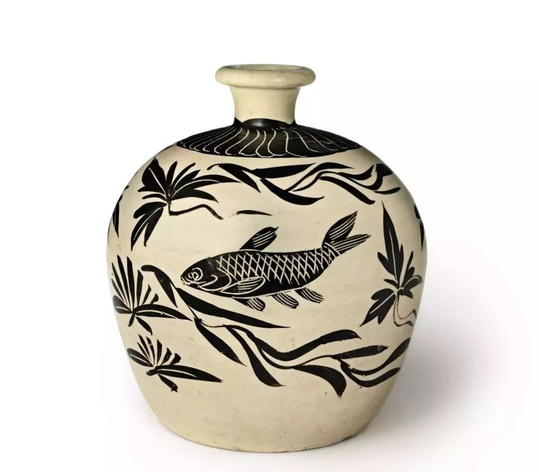 北宋/金 磁州窯白地黑花魚藻紋小口瓶