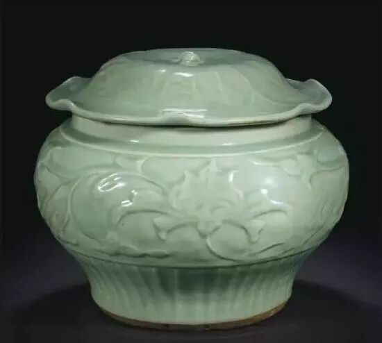 龍泉青釉刻纏枝花紋荷葉蓋罐