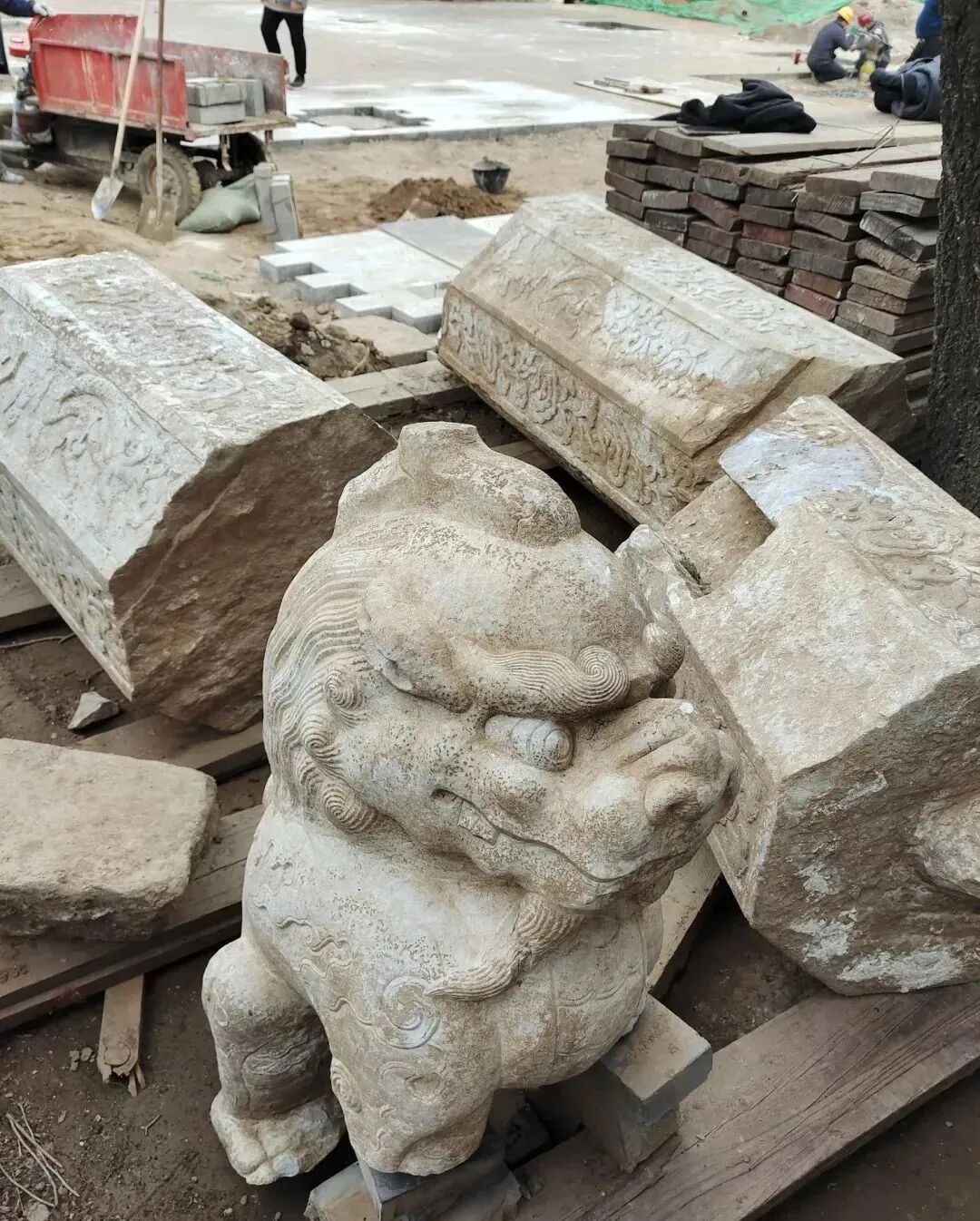 此次修缮过程中还有“意外惊喜”:在清理一处清代垂花门遗址下的泥土时,发现了一座断成四节的华表,华表是明代的,八棱状的华表柱上雕刻着草花龙和卷草花,华表顶上蹲着麒麟(吼)。万寿寺天王殿前放置着一块硕大的丹陛石,就是古代宫殿门前台阶中间镶嵌的那块长方形大石头,也是此轮修缮过程中发掘出来的。