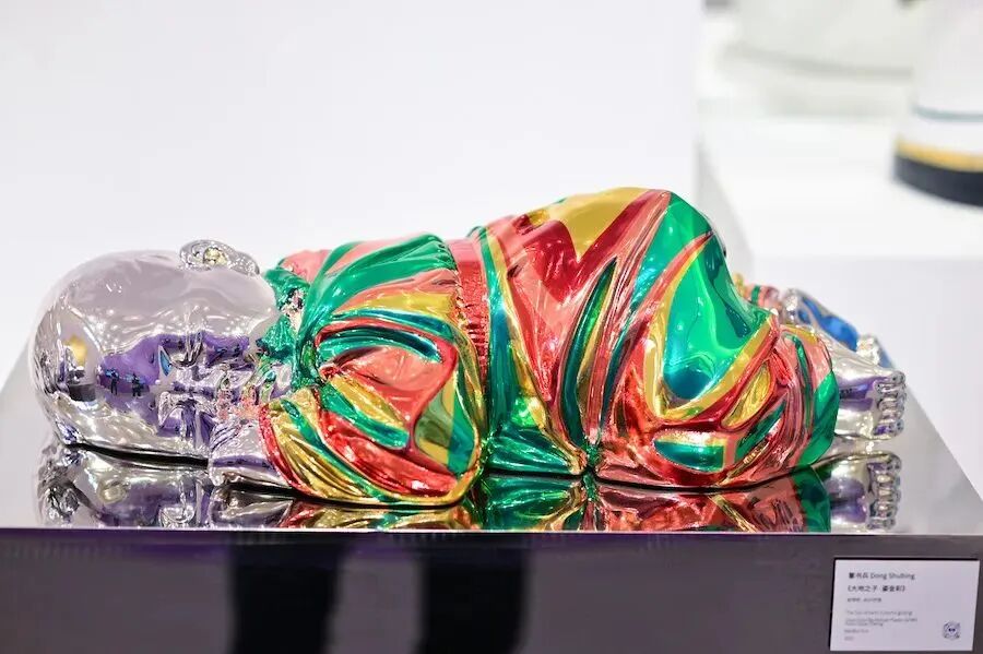 董书兵以敦煌文化为灵感创作了《大地之子》,它是一种震撼人心的大地艺术,同时又给人带来如初生婴儿一般的情感联结。《大地之子·鎏金彩》将敦煌石粉彩绘所呈现出来的流金溢彩效果,定格在大地之子这个流行艺术雕塑上,触动人心。姜斌也将敦煌文化和他独有的“东方波普”艺术语言结合,带来《东方宇宙人雕塑》及其数字艺术作品。