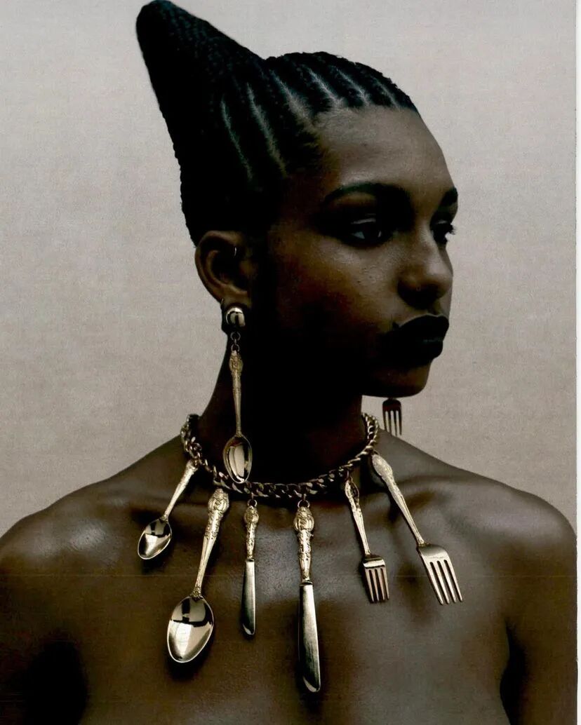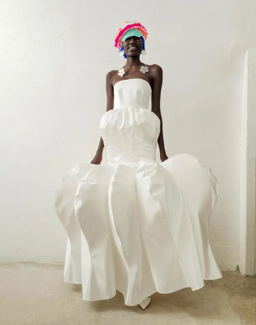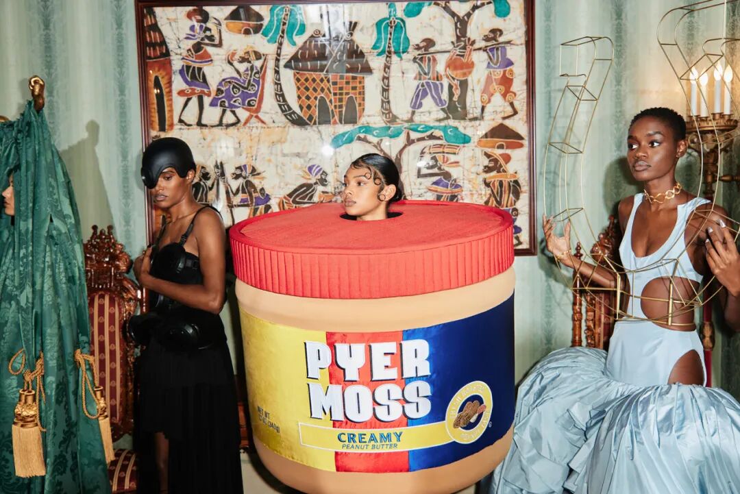 Pyer Moss 2021 秋冬高级定制系列Raymond 从日常生活中汲取灵感,将打字机、花生酱等生活家居物品转化为时装,利用的元素本身都由黑人设计,借此机会将它们重新介绍给黑人。