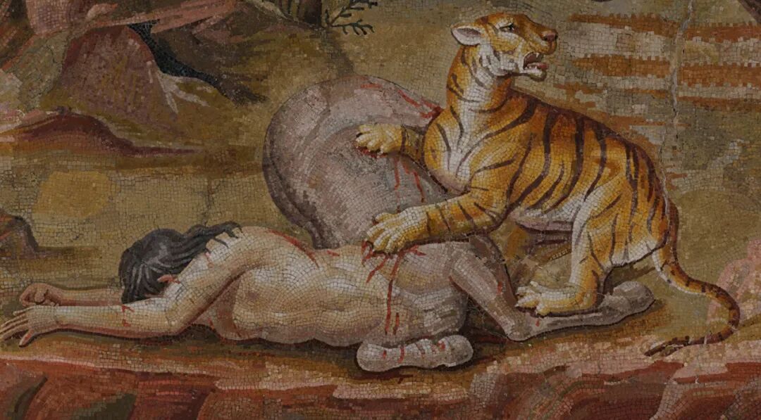 《人马怪勇斗大猫》Pair of Centaurs Fighting Cats of Prey(局部),哈德良蒂沃丽别墅马赛克 Mosaic from the Villa of Emperor Hadrian near Tivoli,约公元130年,柏林老博物馆 (Altes Museum, Berlin)。