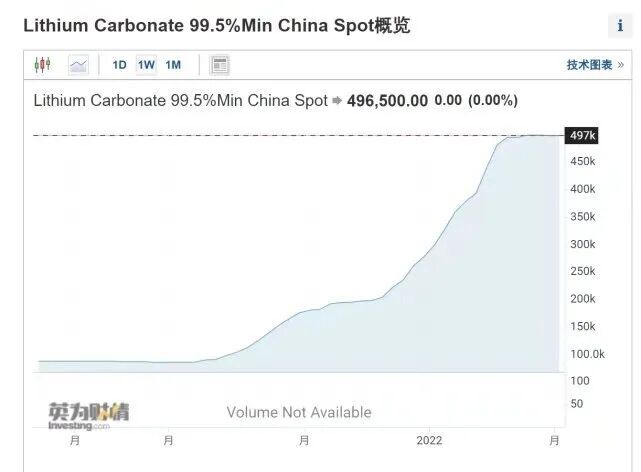 这是最近一年锂矿价格的走势图,从去年上旬的大约8万元/吨,直接暴涨至现如今的约50万元/吨,涨幅超过600%,用疯狂来形容并不为过。