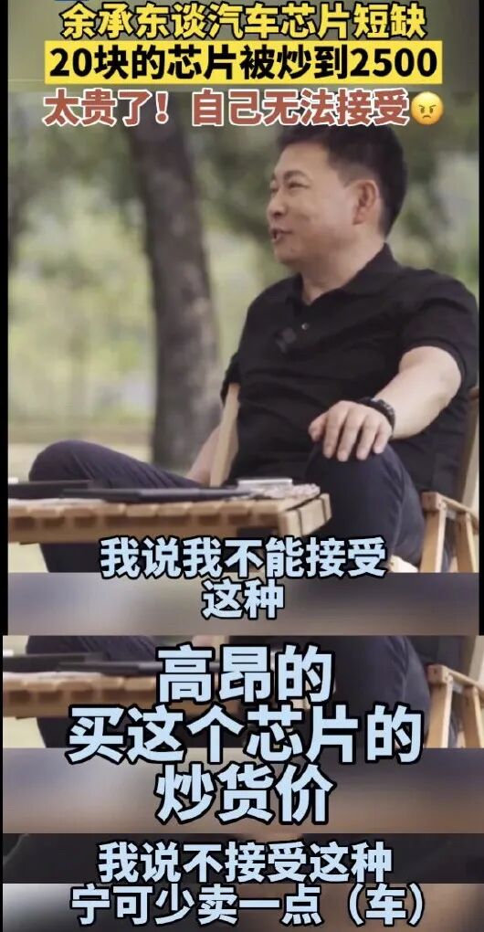华为常务董事、智能汽车解决方案BU CEO余承东在面对媒体采访时直接表示,高昂的芯片价格不能接受,“宁可少卖一点(车)”。