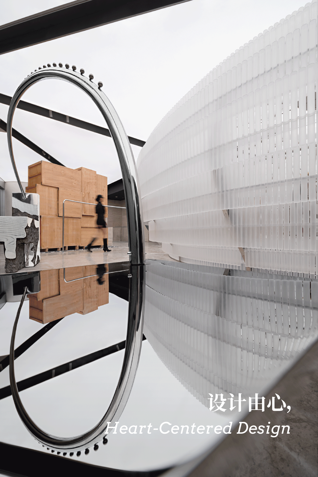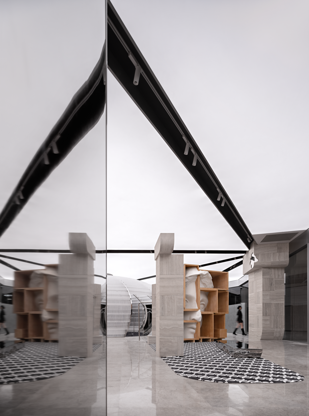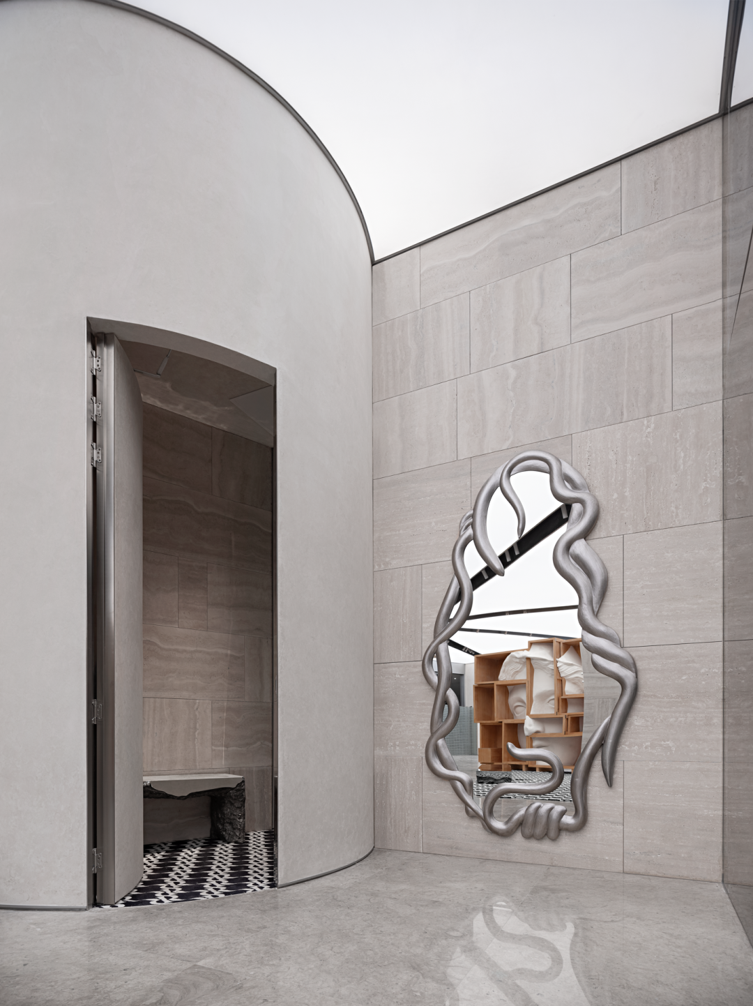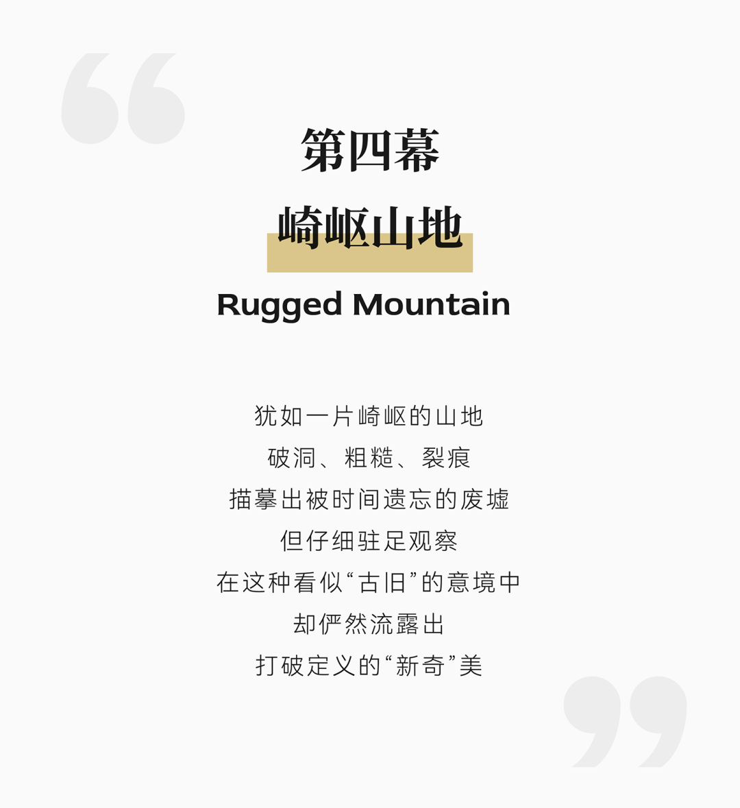 立体不规则的“山地”布景,一边刻着原始斑驳的材质纹路,一边连着属于未来的自由意志。模糊新旧的设计语言,令每一步的空间体验,都交替着艺术与现实的碰撞,释放着挣脱风格束缚后的另一种新奇可能。