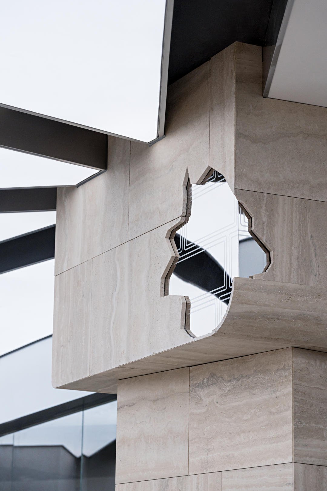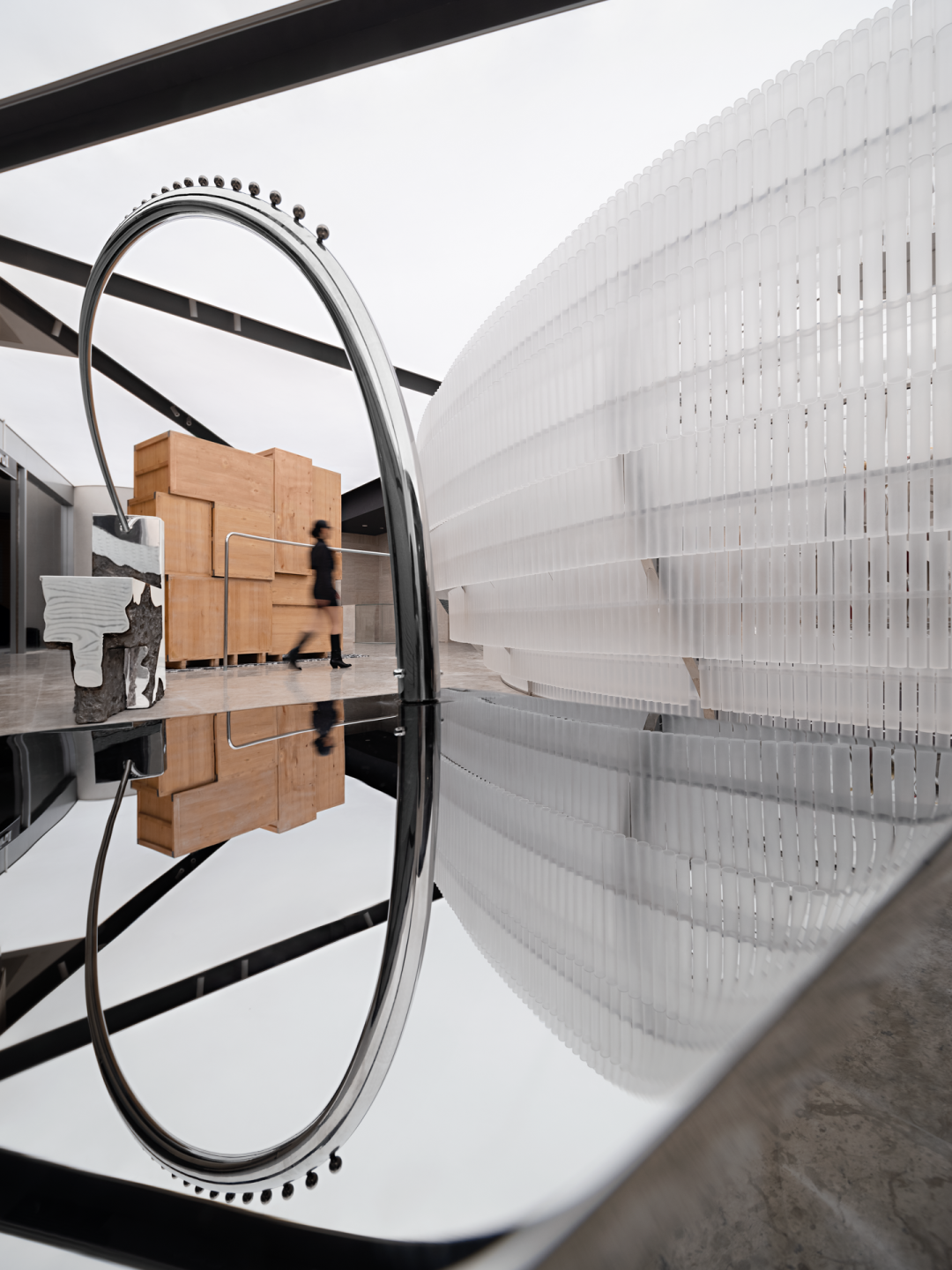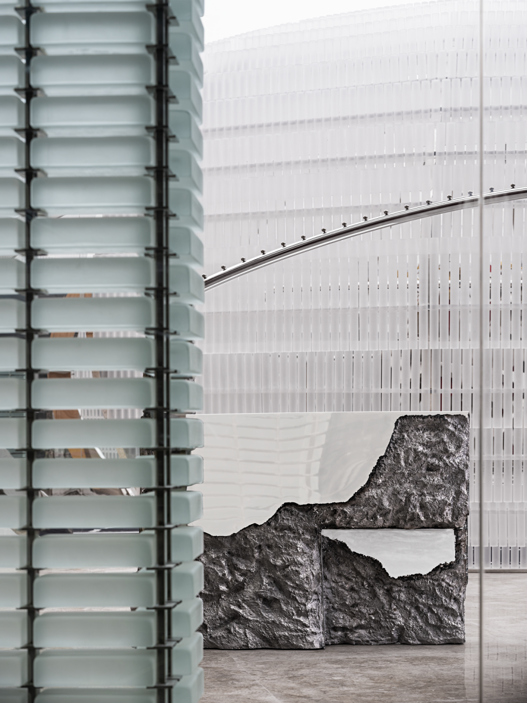 与此同时,金属与石材相嵌的支撑架,改变了枯燥平淡的展示方式。亦如一个充盈着崭新秩序的世界,包容、多面性在此集聚,在打破规章定义的同时,也令产品多了一种独一无二的美。