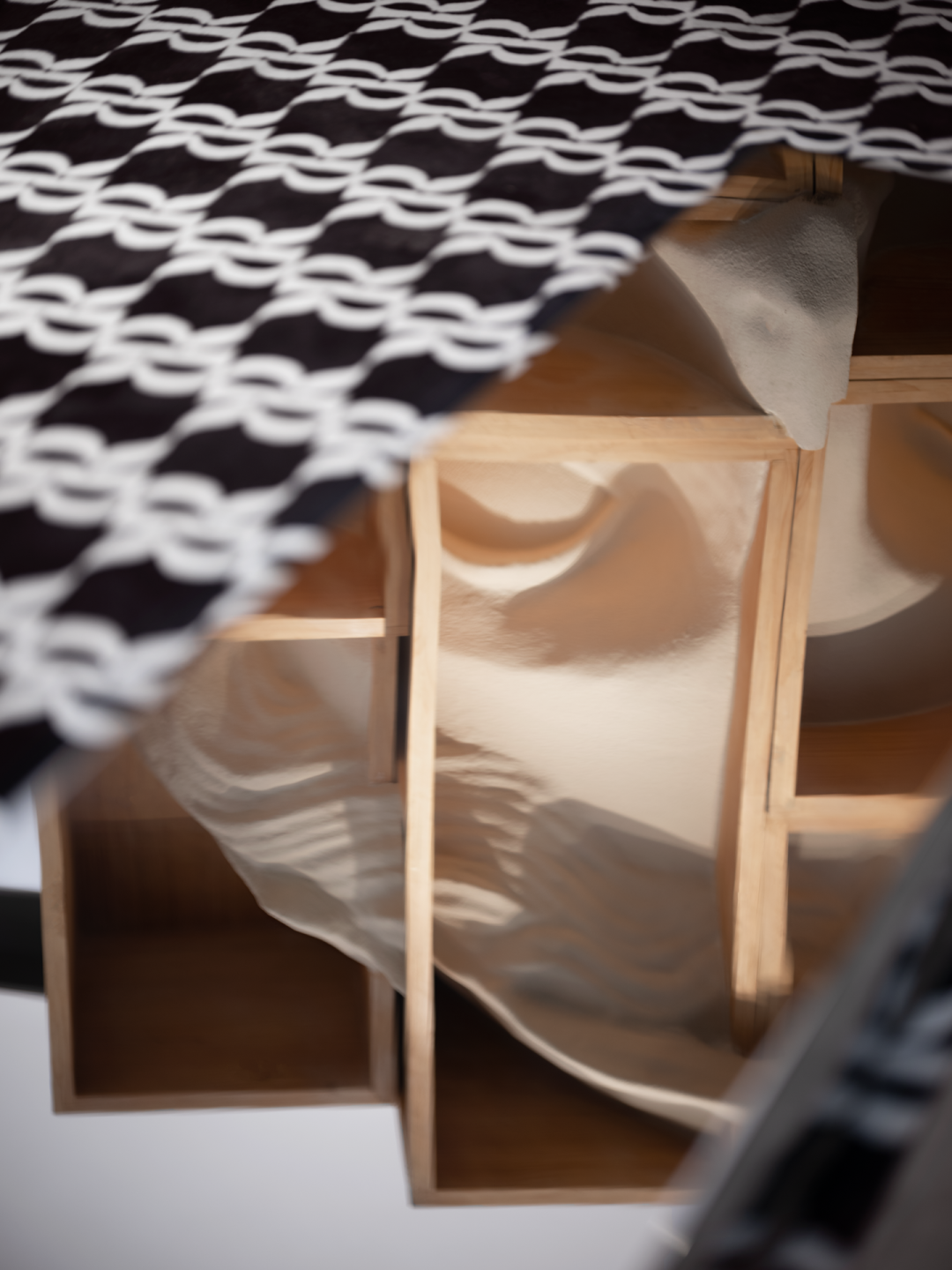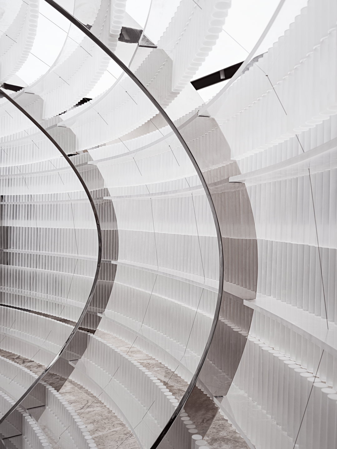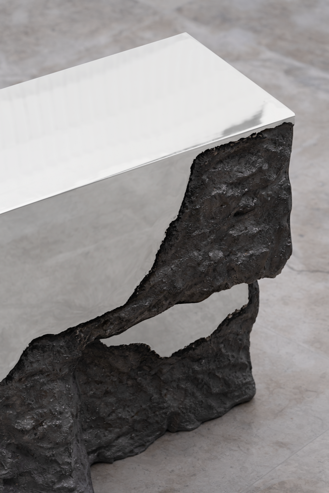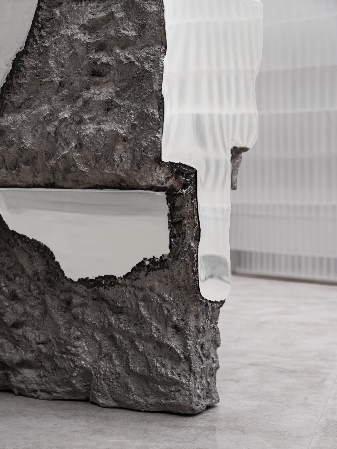 与此同时,金属与石材相嵌的支撑架,改变了枯燥平淡的展示方式。亦如一个充盈着崭新秩序的世界,包容、多面性在此集聚,在打破规章定义的同时,也令产品多了一种独一无二的美。