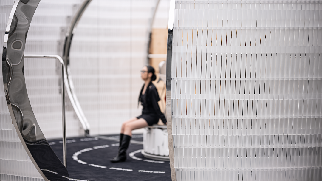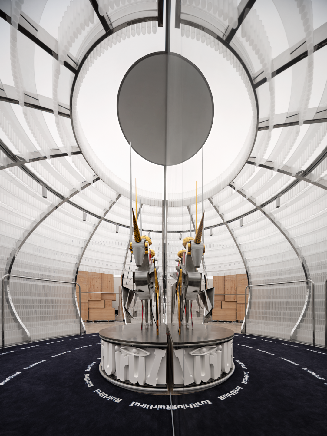 在这场未来遗迹的布景下,设计师透过陌生化的视角模拟古典叙事,试图在视觉与感知层面,构筑观者对未来乌托邦世界的想象。于是,两种叙事语言在这里穿插呈现:一面是现代化的磨砂亚克力材质,一面是带有古旧色彩的古堡意象。