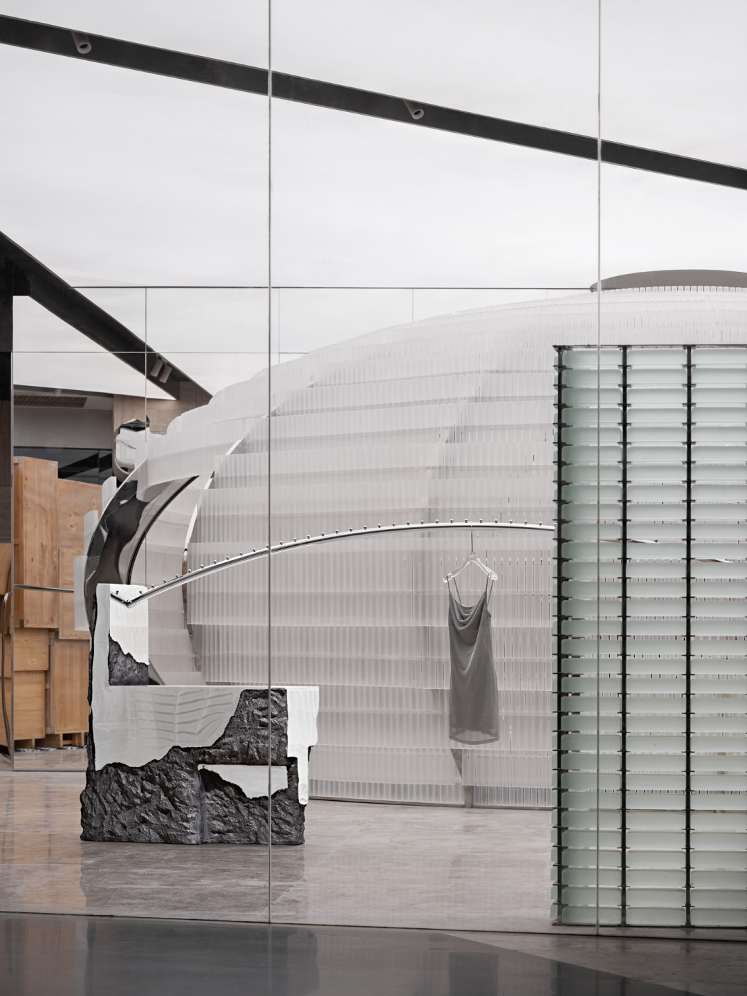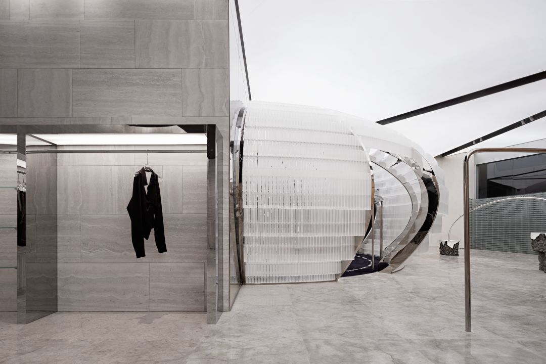 步入试衣间,流线金属边框勾勒的镜面,以先锋化的美学处理,再次刻下品牌文化的注脚。“于设计而言,这一空间语言的力量,正来自于对传统形态的高调反叛。更直接地说,这创造了一种消费者与品牌、与服装的独特交流方式,并生动地表达着品牌的独特气质:独具魅力、充满韧性。”