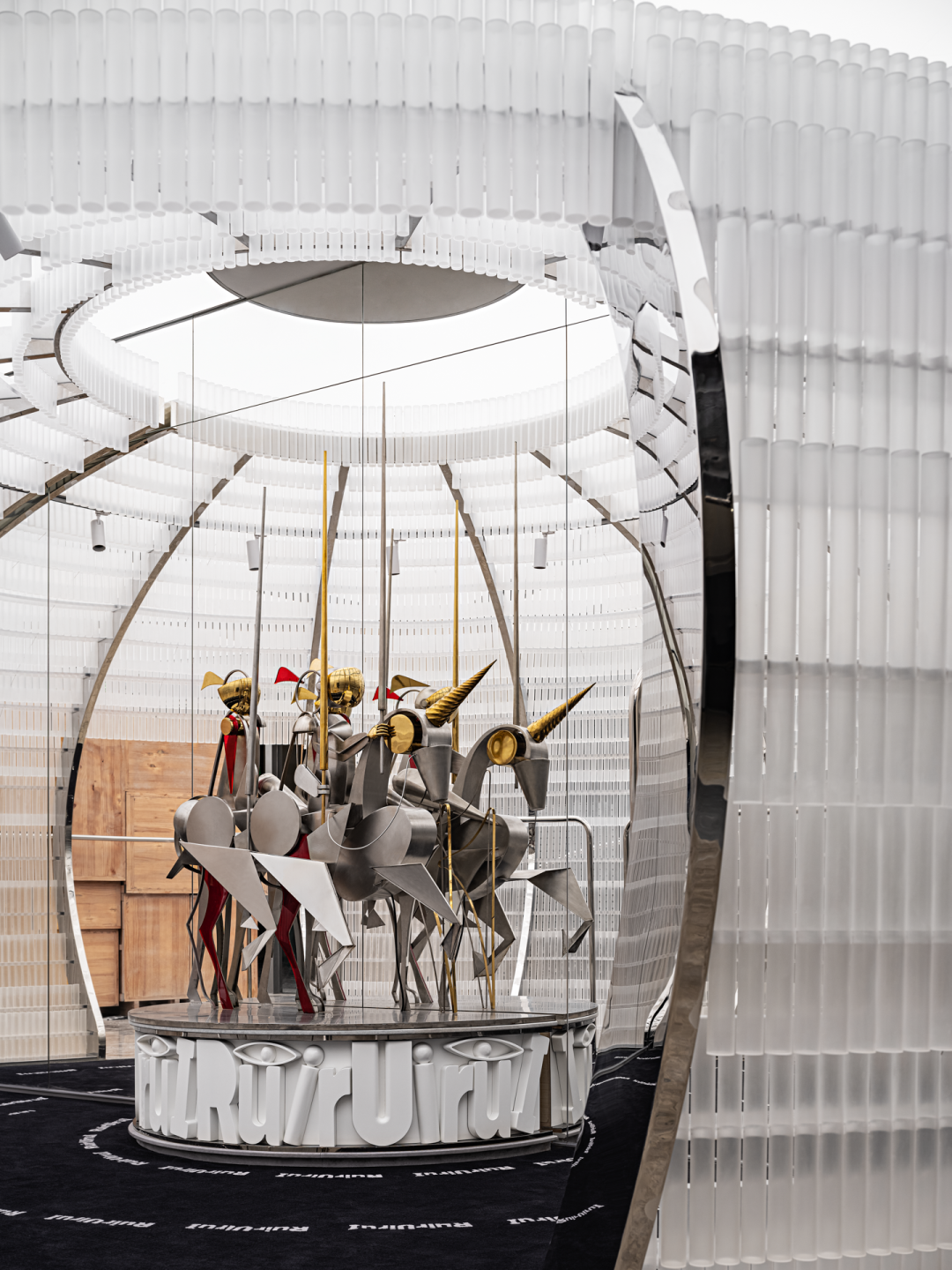 骑士剧场的构造,勾勒出超脱日常的艺术体验。对此,设计师说道:“日常戏剧化的展演,出于对刻板风格的挑战。正如RuirUiruI品牌内核中的趣味时髦unisex,跳出框架的场景建构带来的是常理之外的无限世界。”