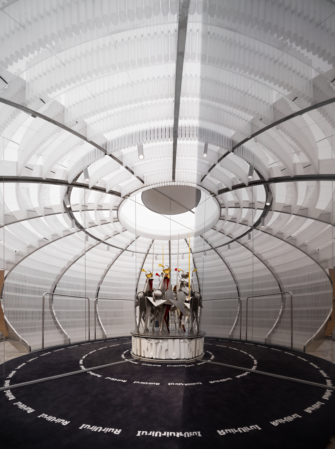 “深入RUI的品牌基因,无论是对固有文化的反叛、对乌托邦式自由的解构,还是INsoul的品牌愿景,均传递出一种鲜明态度:不被风格定义,大胆探索独一无二的真我。”于是,以贝诺佐·戈佐利的《伯利恒朝圣之旅》为灵感,设计师透过模糊新旧的美学语言,将画面叙事拆解为4幕「未来遗迹」场景 —— 古堡剧院、人文骑士、柔韧铠甲、崎岖山地,借此将蕴含在空间中的探索精神,化为对品牌内核与差异化记忆的深刻强化。