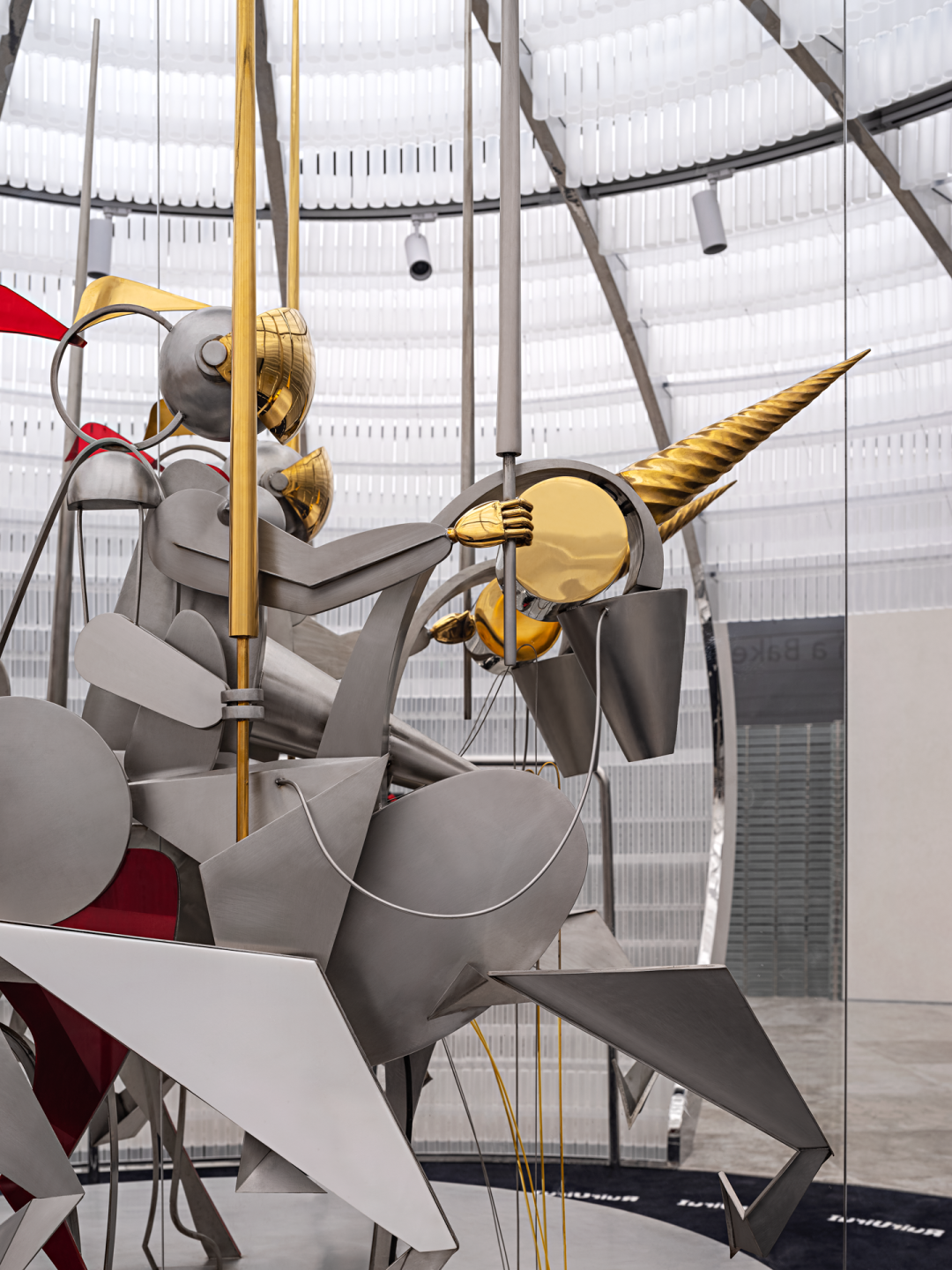 行走至此,一道金属弧线,作为一笔野性而热烈的表达,构就为强烈的视觉观感。“在此,服装是铠甲,而艺术则成为与其相伴的武器。在这样的有趣组合中,时尚与艺术互为照亮,增强着品牌的内在意义。”