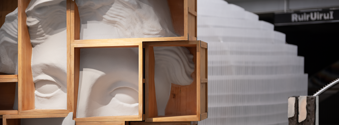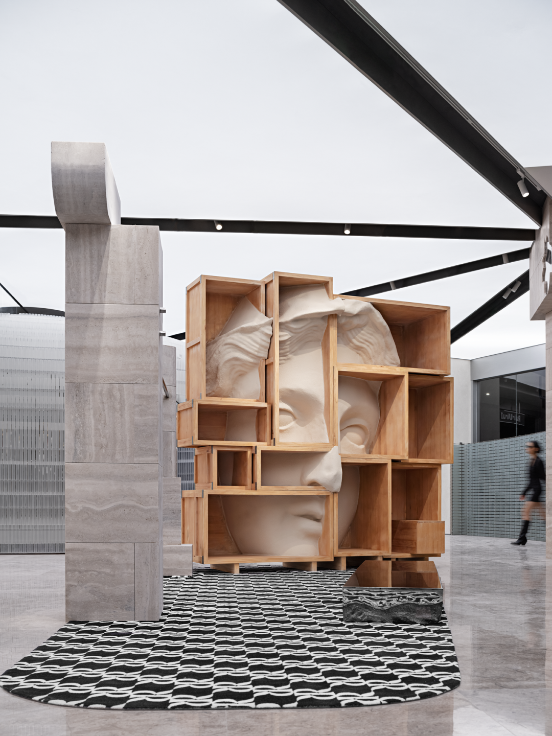 “断壁残垣”的空间表皮下,涌动着无声的沉静力量。而细观其中,人物雕塑装置与周边的残缺石墙,所串联起的复古画面,好似展演着文艺复兴时期人文主义兴起的片段。这种一步一景的变换,让每个角落都变成引人探索的未知领地,实在值得玩味。