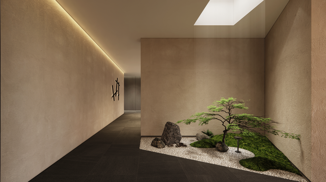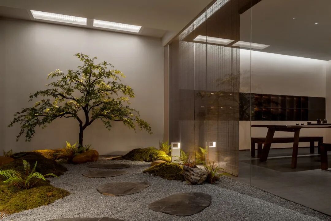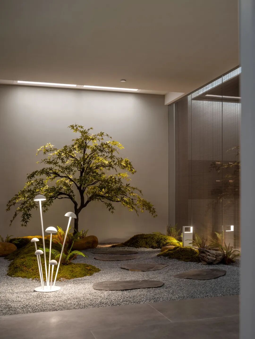 一隅的户外庭院中,一从苔藓、苍翠绿树、山石造景,甚有几分禅意。延续西顿照明的产品线,设计师选用顶部天窗灯的照射,模拟从日升至日落的阳光色温变化。在草坪沙石的布景下,小巧秀美的草坪灯、壁灯、地面装饰灯得到了形式多样而又鲜活十足的展演,透着一片盎然生机的景象。