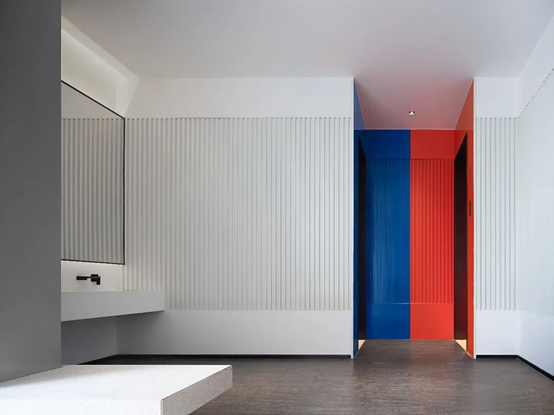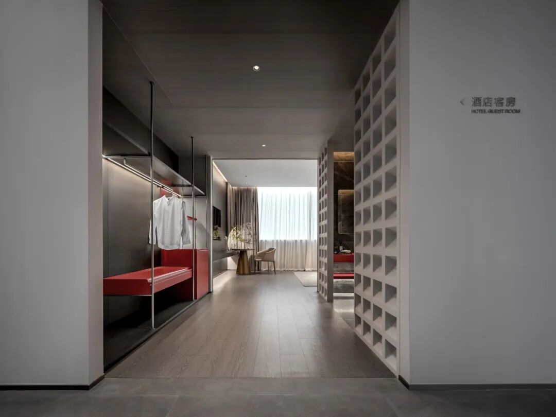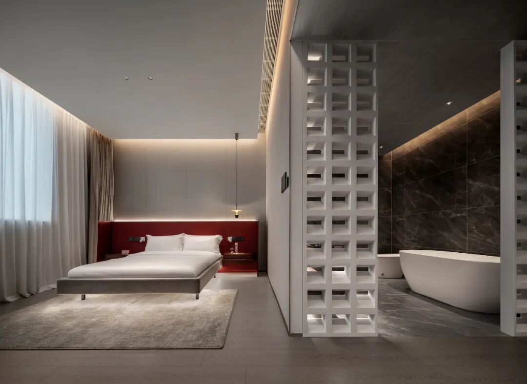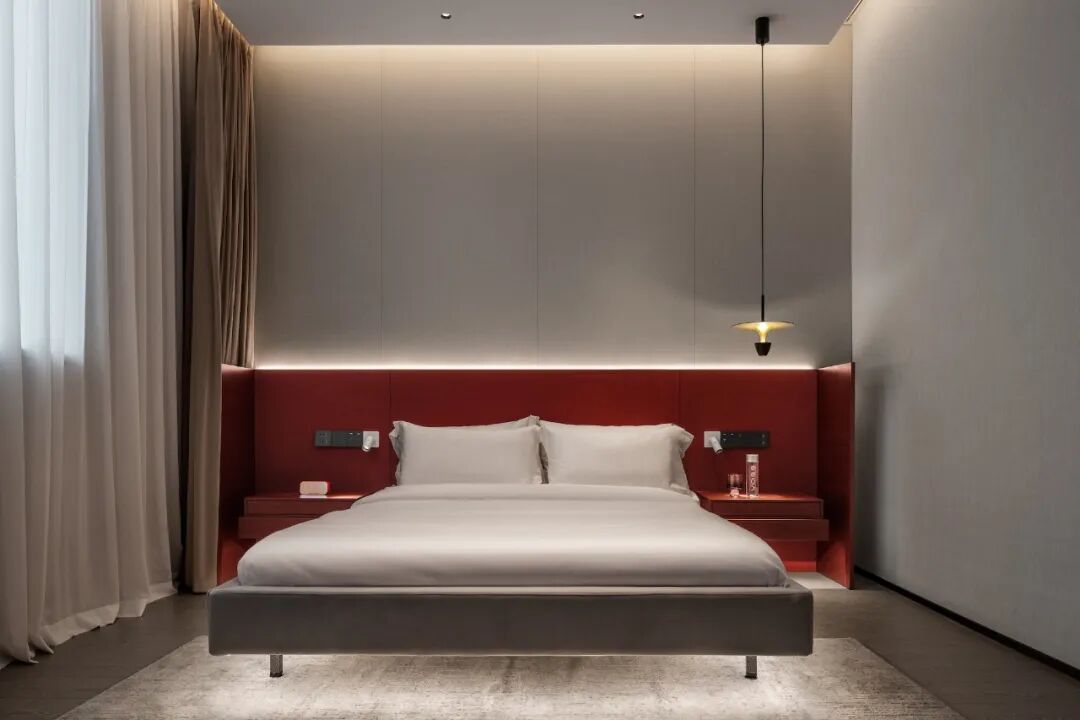 设计师强调智能照明赋予精品酒店场景的便捷及舒适性,在天花造型、床沿底部、床头桌底部、洗手台底部、衣柜隔层等各局部细节中增添间接照明,映衬产品的精良工艺。借由艺术与功能的平衡,床头垂坠的艺术吊灯,在正红色床头板的映衬下,更显意境氤氲。