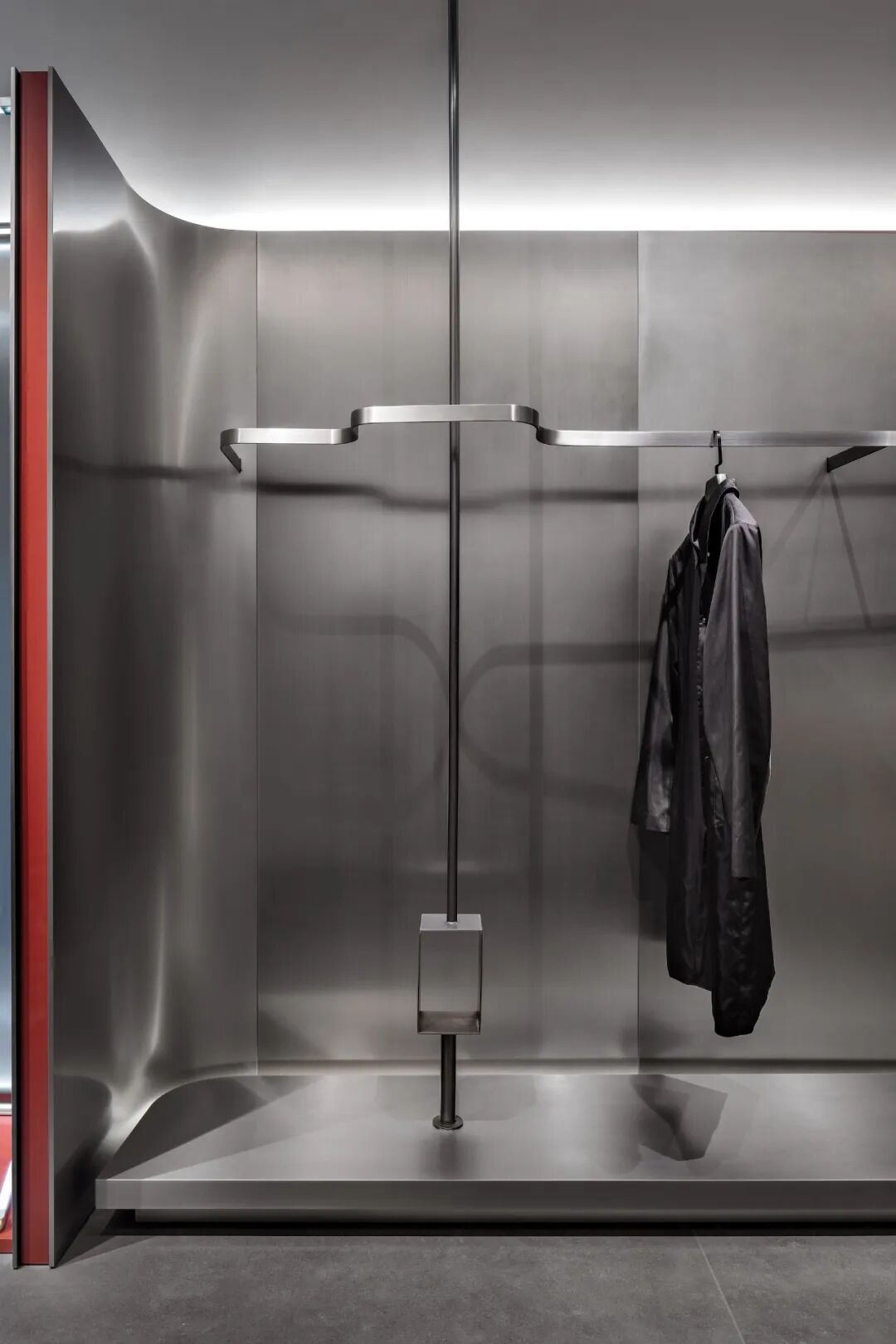 关注于品牌视觉形象的塑造,设计师于门店入口处,运用独具现代感的拉丝不锈钢材质作为主要材质,统领简约时尚的视觉观感。与此同时,立体的建筑体块带着强烈的结构感,加之粗糙的肌理漆面,最大化还原了光本身的质感,以富有时空感的创造,吸引着路过的行人。