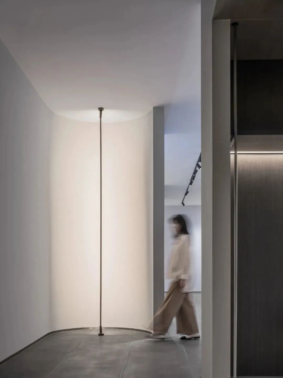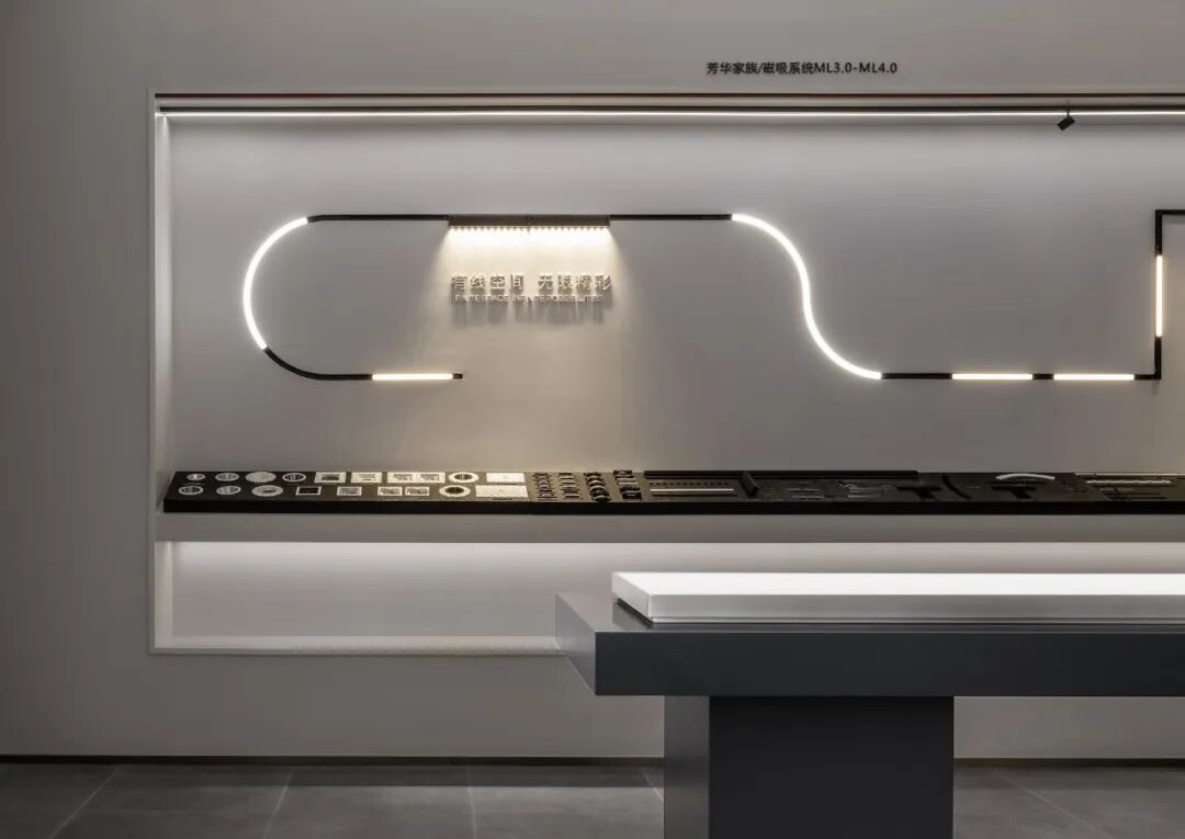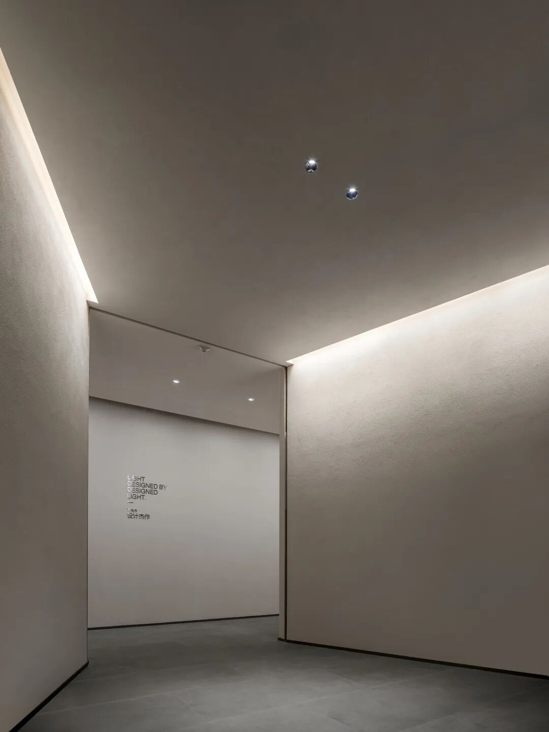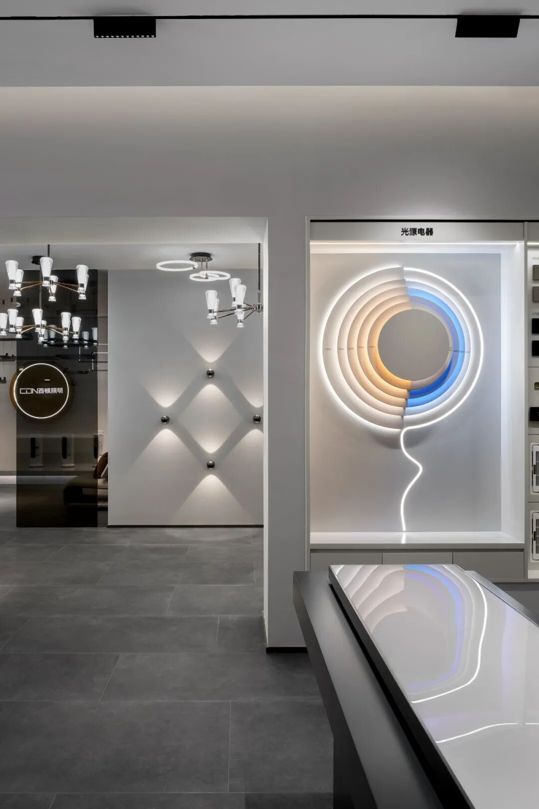 在产品展示区,设计师对不同系列的灯光进行统一规划。其中简灰色的墙体与地面,不仅使得空间氛围变得沉静,让观者的注意力集中于灯光本身,更于充满秩序感的铺设下,散发着产品的工业美感。