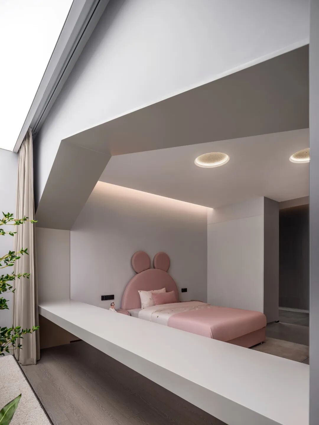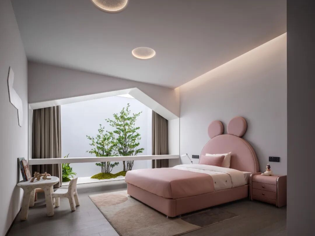 在这片温馨的“童趣岛屿”中,有助于儿童成长的健康照明是空间的主题。取代点性光源,设计师以温和的可调色面光源,匹配玩耍、助眠、学习等使用模式。而考量到视力健康,设计师亦通过窗景写字台与绿植景观的搭建,创造了一处舒缓视觉的缓冲地带,给予儿童细腻入微的呵护。
