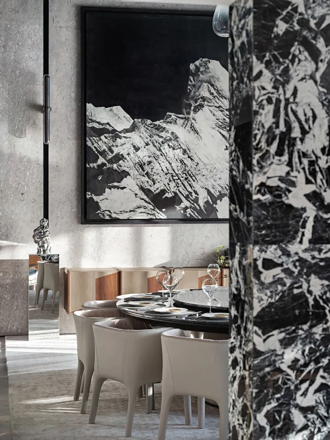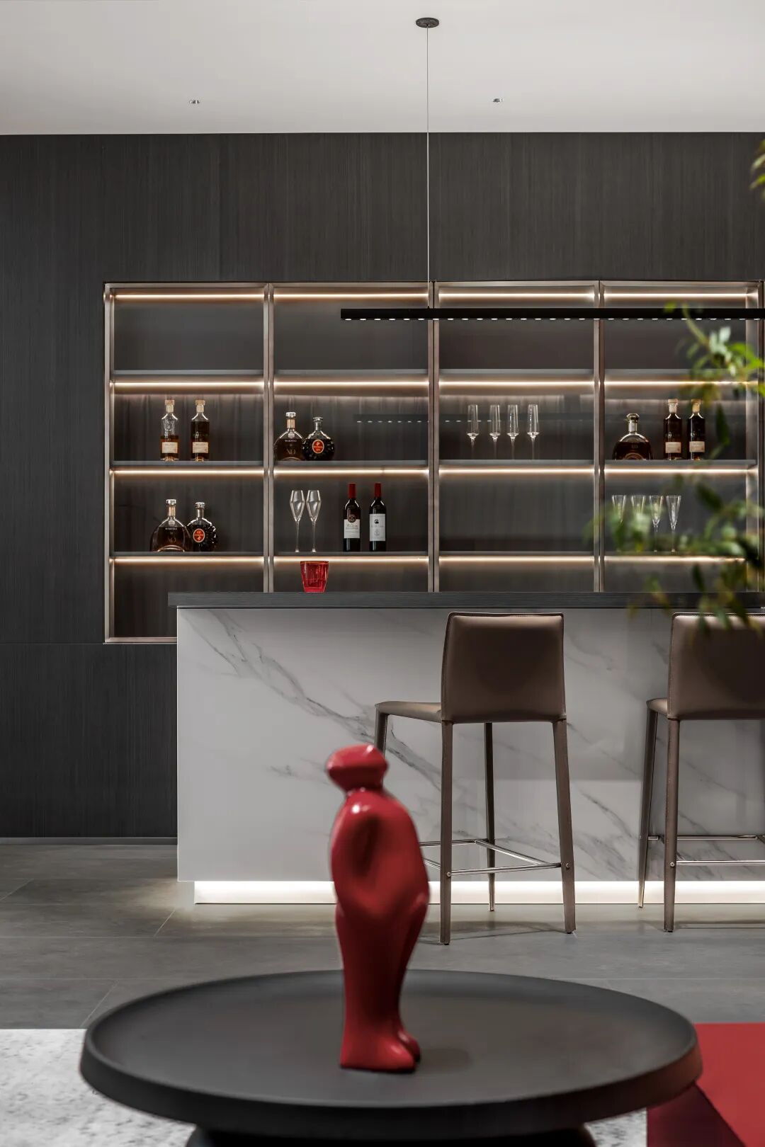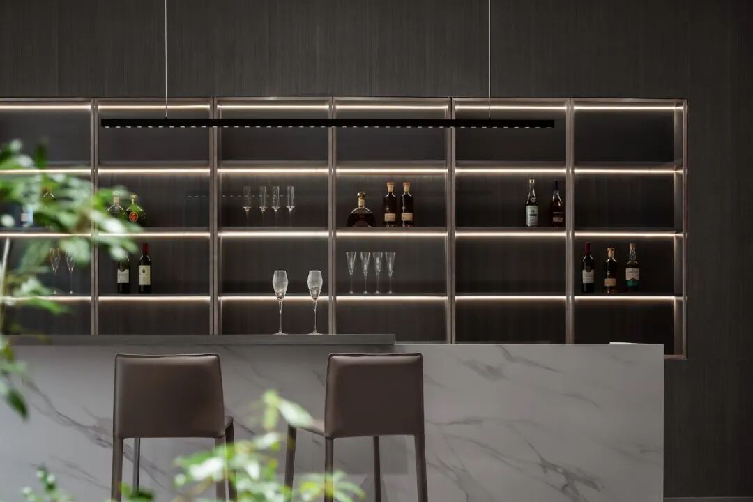 “从品牌方与使用者的角度出发,我们所关注的,不止在于照明产品本身,更在于其之于场景的融入性。”当观者踱步至另一侧的吧台区时,与友人精致小酌的画面便随之涌现。兼具对灯光功能与美学的双重考量,设计师在长方形方桌选用吊线型艺术灯具,增强空间立体感,凸显食物本身颜色;玻璃酒柜每格夹层特设暖调线性灯光,烘托悠闲品酒的惬意情调。
