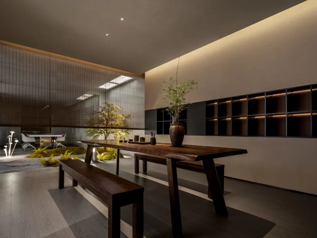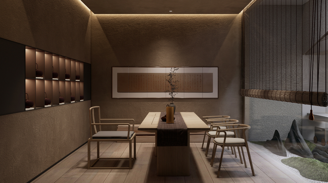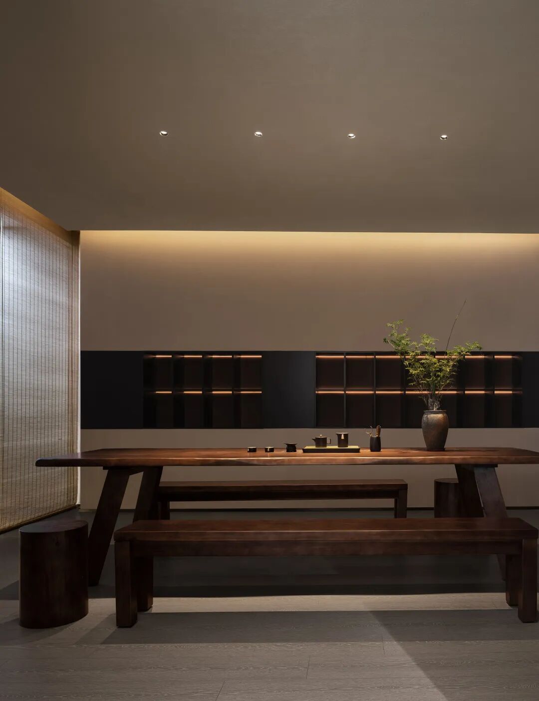 静雅的东方茶室,映照的是繁杂中放慢脚步的闲逸心境。为烘托私密而悠闲的情境氛围,设计师对茶台上方予以重点照明,并于其它角落穿插以间接或装饰照明,构就明暗对比的画面视效。当再细致观察时,艺术小品的点缀伴着灯光的铺陈,折射出物件的光影美学,在升华意境与韵味的同时,让人不禁流连忘返。