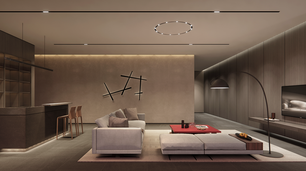 品质客厅的场景构建,依据大宅空间的尺度和配置而设。在产品与生活的紧密结合下,设计师对不同的照明产品设置及色温进行专业严控。无论是日常中的归家、接待会客,抑或是躺在沙发上与家人悠闲观影,体验者均可于设计对氛围的精心铺垫中,遇见内心理想生活方式的真实模样。