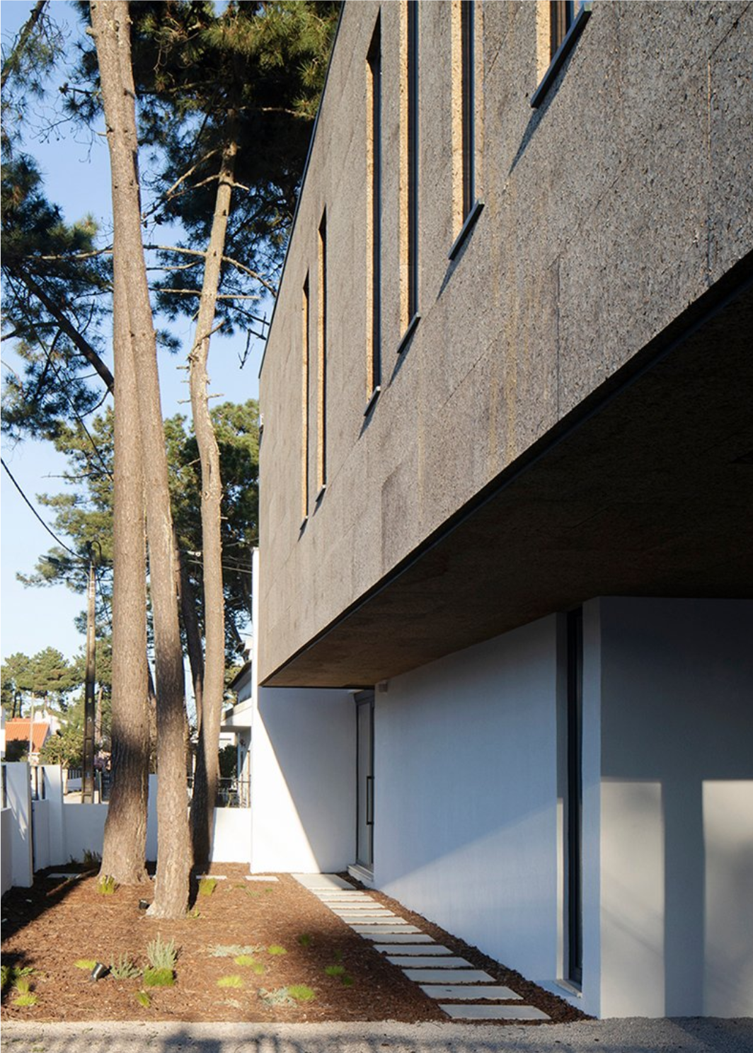 由于靠近葡萄牙海岸,阿罗埃拉长期以来一直是度假的热门地点。但是因为该地区的土地纠纷问题,松树林区一度遭到破坏。为了保护林地的自然生态,在设计房屋时,Inês Brandão Arquitectura 选择软木作为房屋主要的覆盖层,其颜色和质地与周围松树的树干相呼应,保留了自然景观的整体性。软木是一种可持续的材料,可再生、耐腐蚀,隔热性强。