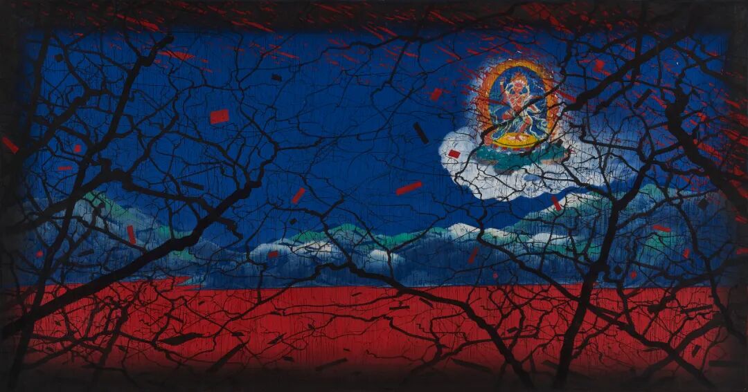 在悉知画家思想性之下,再看邵泳的画,一种庄严、肃穆、清净的禅意扑面而来。色彩的叠加、光与影的变幻,外在的看,是邵泳的表象手段,本质上是他作为一位瑜伽士的发心。邵泳把佛教的文化思想融进艺术创作中,将自己藏进了画中佛的符号影子里,道成肉身的上师、供奉处的天降舍利、飘扬的经幡、变幻的手印……他以绘画为修行,用绘画渡人。