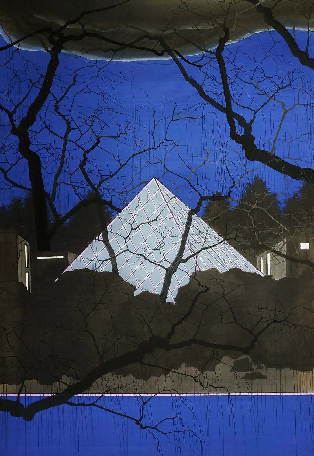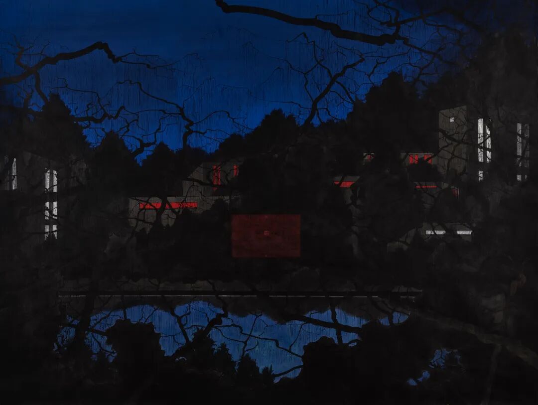 此系列从2013年邵泳工作室搬入北京当代艺术馆之后就开始创作,最初的一些作品描绘的是其工作室的景象感受,到2019年纽约个展《山水国度》时,观念语境自然生成,画面中的宇宙、星空、动物、人、海、别墅等现代符号意有所指。如今我们再看“山水国度”系列新作,艺术家一方面极其注重水墨媒材的特殊表现,另一方面还巧妙地转换了全新的图像,成功地创造出属于自己的全新语言。新的图像既积淀了新的生命经验与艺术观念,也契合了新的文化价值与审美取向。