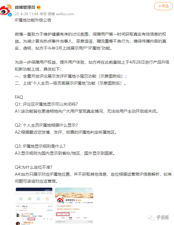 昨天4月28日,新浪微博开启了IP归属地功能,上线了“评论区IP小尾巴”和“个人主页IP属地”也就是说,以后发微博回微博,都可以知道是在什么地区发的了。