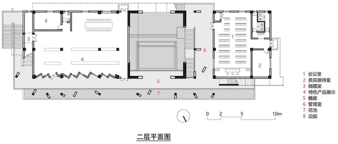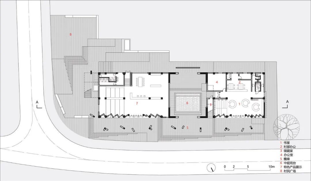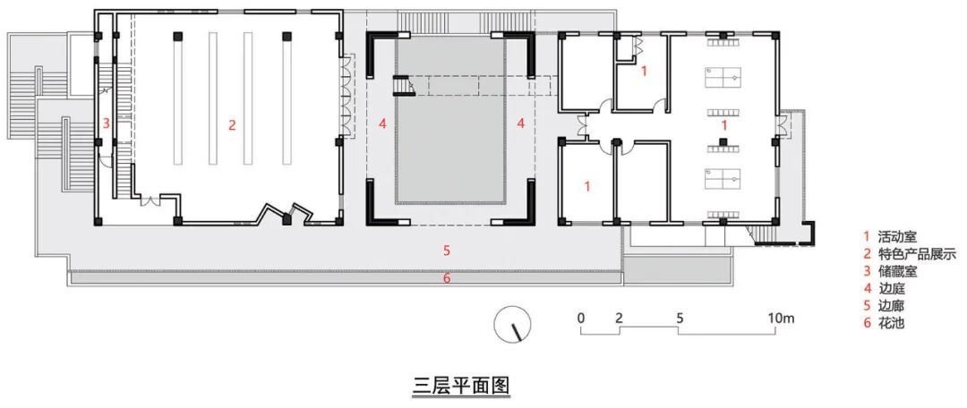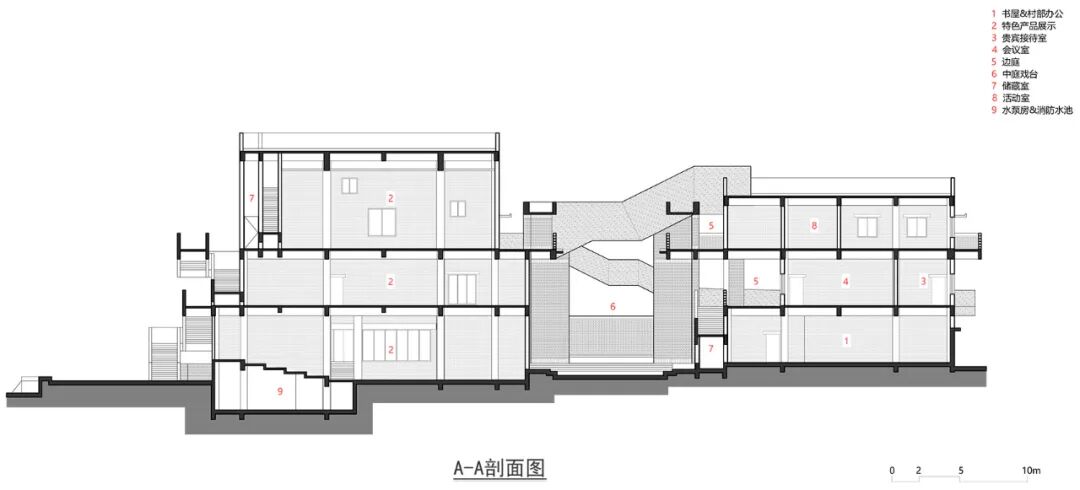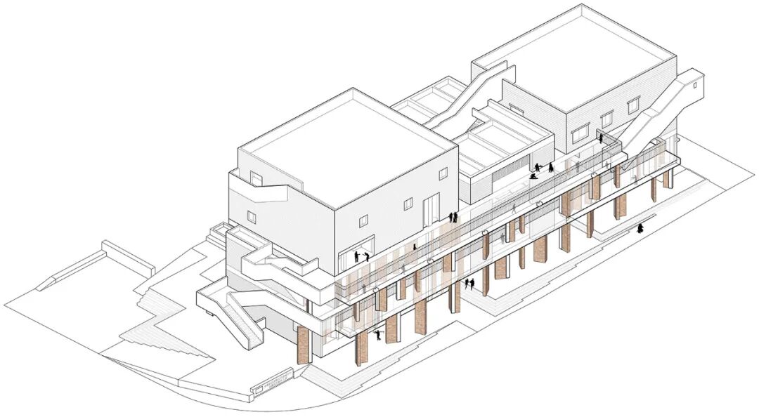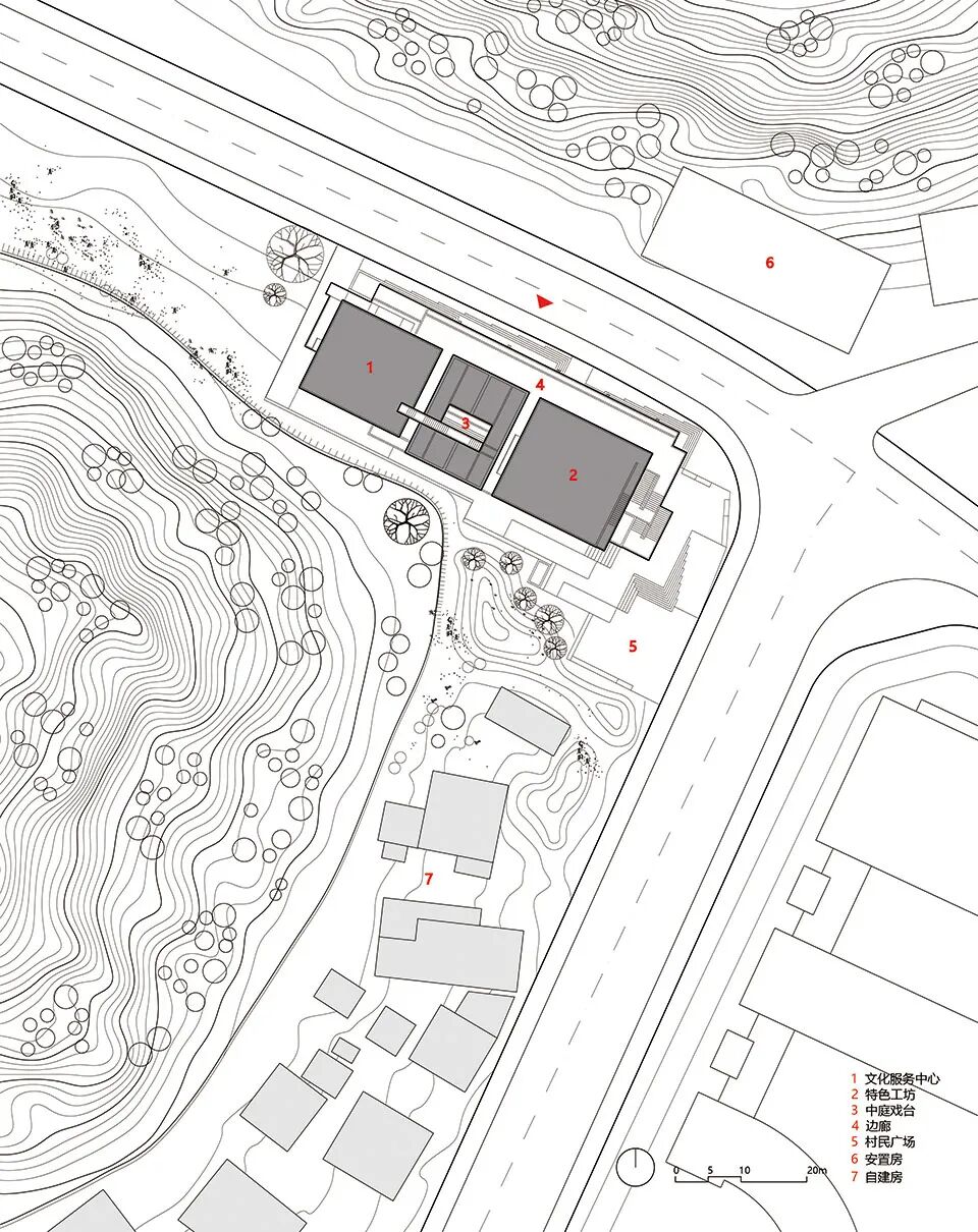 项目基地西高东低有约两米高差,顺着高差将场地划分为三个台地,自西向东依次为:文化服务中心、中庭戏台、特色工坊,通过连廊将其串联起来,即相互独立又互有联系。