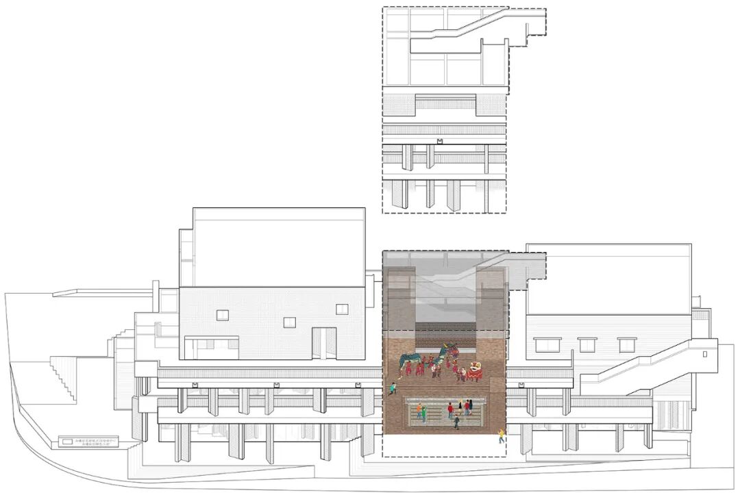 天井与“堂屋”:中庭戏台的空间原型来自当地新老民居中的堂屋和天井。该空间即是满足村民节庆活动的一个仪式场所,同时也是村民日常休闲的汇聚点。设计中将檐廊、中庭、天井以及戏台一同建构起“排门-院落-天井-堂屋”的空间序列关系。