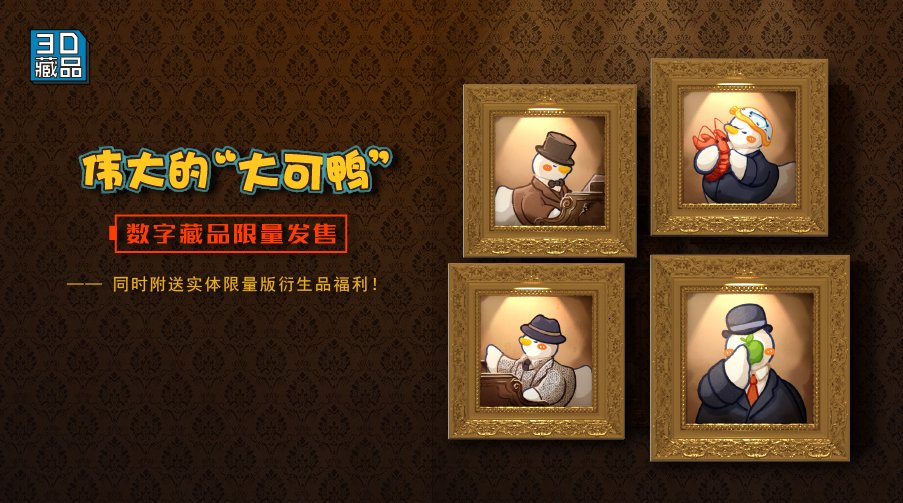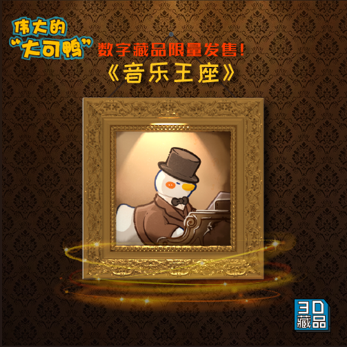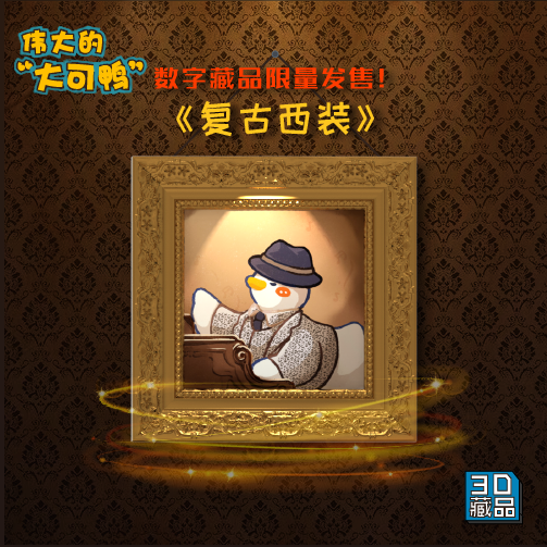 《伟大的大可鸭》数字藏品于11月17日在微博Top平台首发! 系列作品一共四幅,分别为《复古西装》、《音乐王座》、《马格利特的苹果》、《达利的思考》。