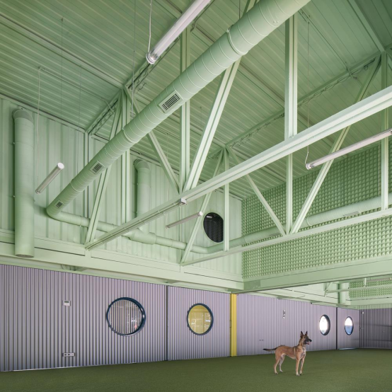 虽然两个主要的教室都用于犬类练习敏捷性,但鸟巢位于楼上的鸟巢立面,拥有鸟类理想的视野和方向。小型猛禽以啮齿动物为食,与农作物和其他当地植物保持平衡。小型鸟类和蝙蝠——它们也栖息在南立面的凹陷中——以昆虫为食,包括携带某些犬科疾病的蚊子,并且是周围田野中花卉和植物授粉周期的一部分。麻雀在这个自我调节的生态系统中出现,在建筑边缘的圆形孔中筑巢。