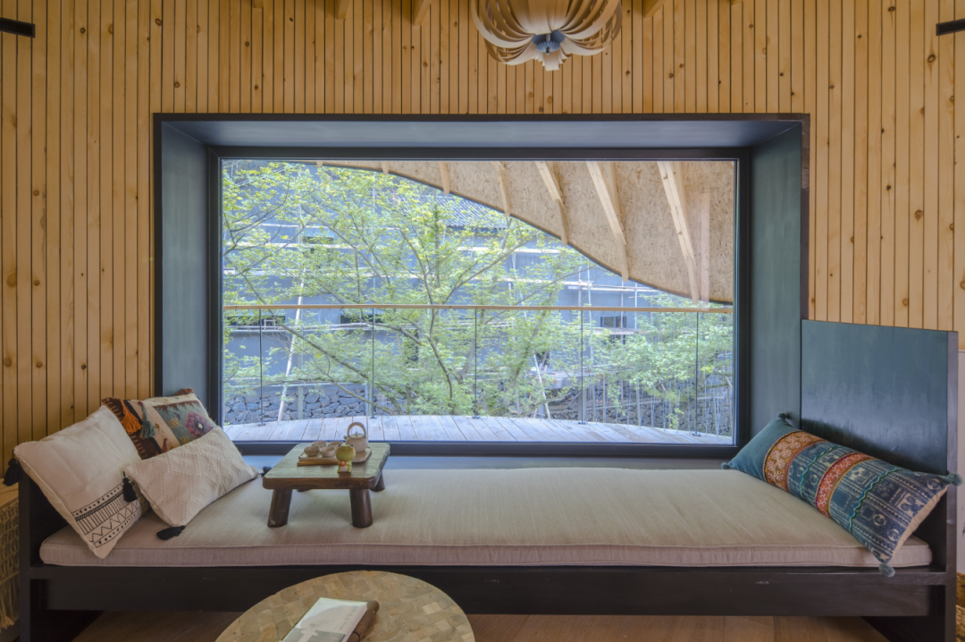 高低渐变的屋檐下,开了数面侧窗,确保房屋的任何角落都可坐拥一窗山水。