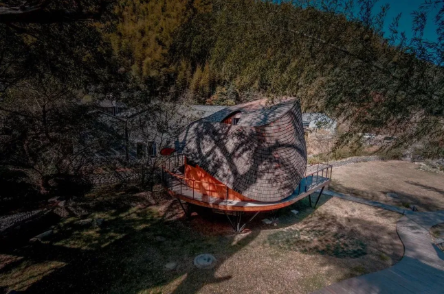 鸟巢树屋是树蛙部落·余姚所特有的,绕过悬挑在溪边的露台,便可移入室内。